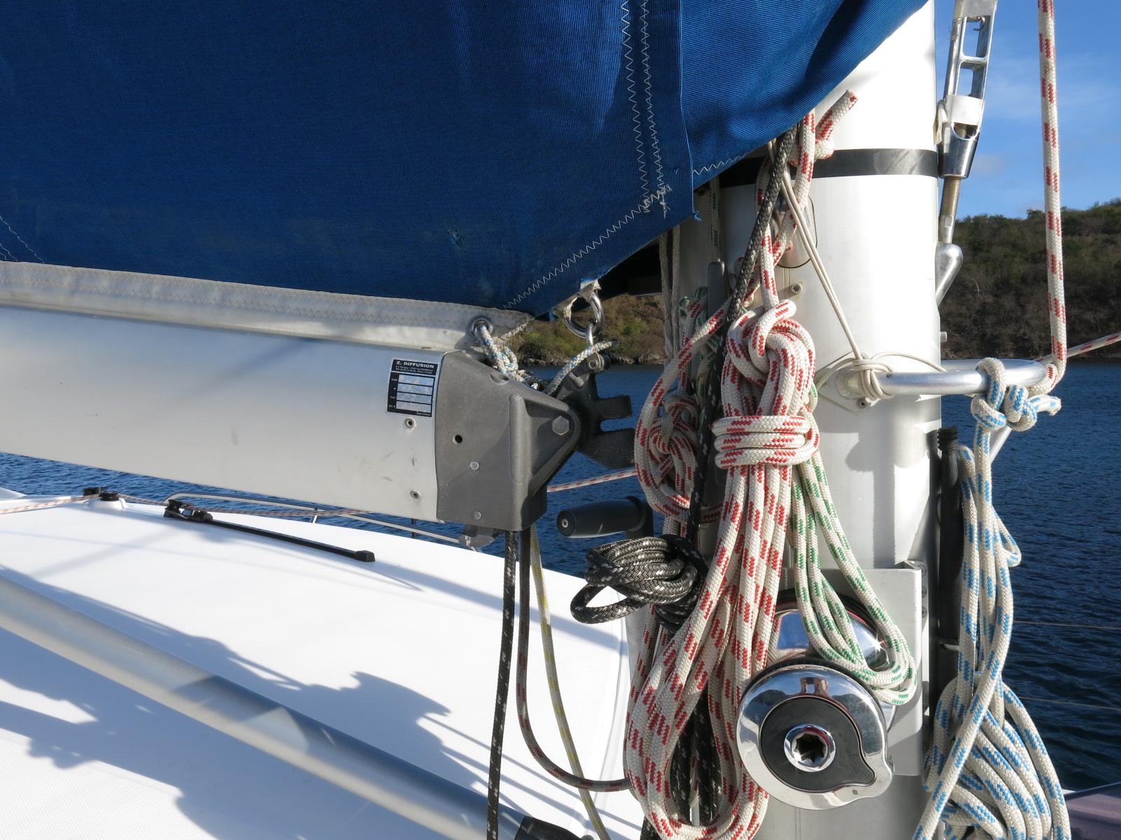 As we had the parts to repair the problem Rick and I tried to see if we could fit the gooseneck back together. We soon discovered that it wasn’t going to be as easy as it looked and we decided to let the Moorings remedy the problem. A couple of calls back and forth with the Moorings office and about an hour later a technician from Union Island along with his two helpers showed up. About 45 minutes later Earl and his assistants had the boom reattached to the mast and we were good to go.