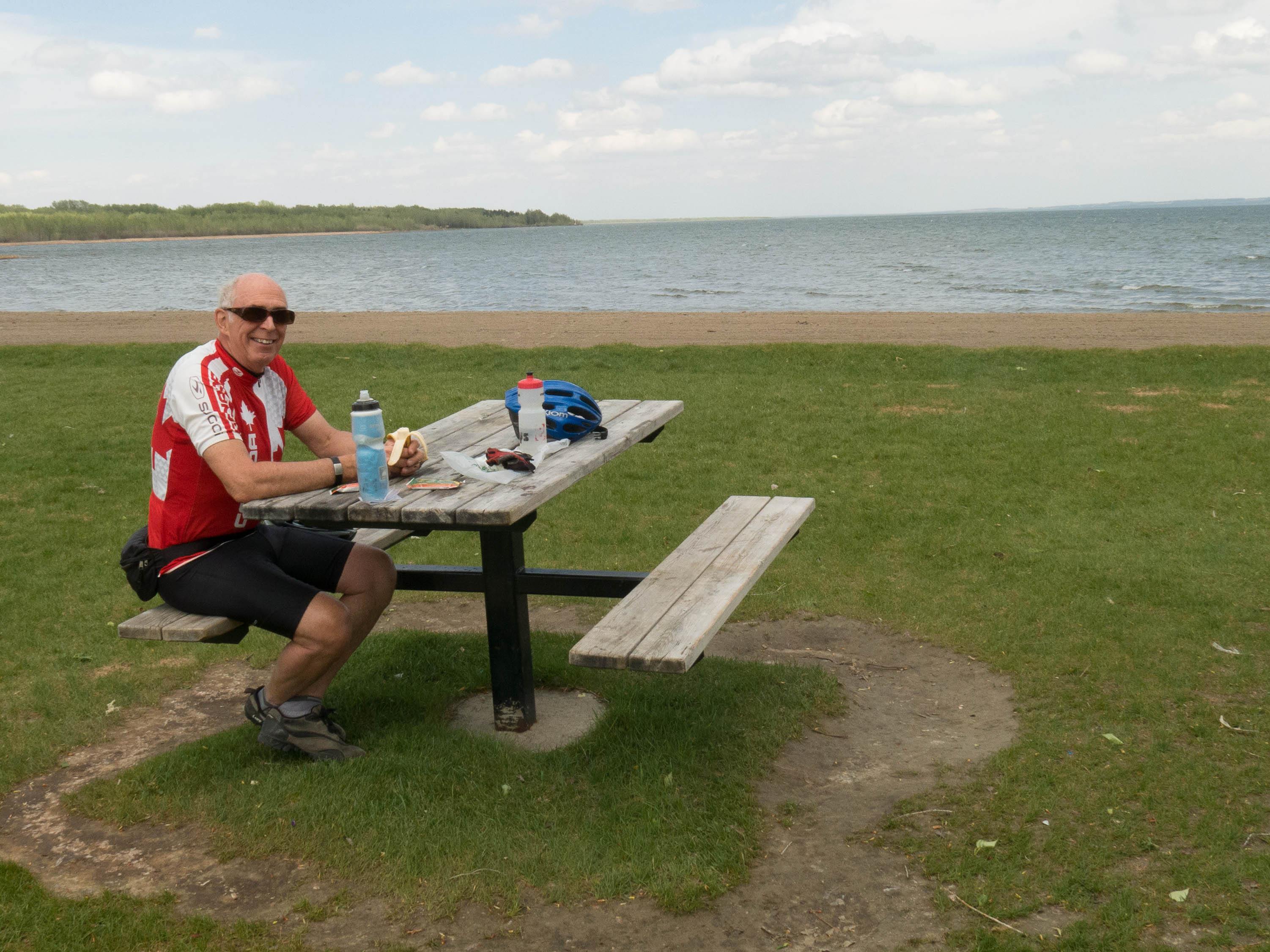 We continued east from Bentley past Gull Lake. By now we were headed straight into he wind and the pedalling was extremely difficult. With virtually no shoulder on the road and wind gusts causing us to veer into the traffic lane we stopped a kilometre or so past Gull Lake. As it really wasn’t safe to continue we decided to turn around and find a spot for lunch. As soon as I turned my bike the other way I could feel the full force of the wind pushing on me. As I threw my leg over the bike the wind was already propelling me forward. Within moments I was doing 25 kph and I hadn’t even pedalled!