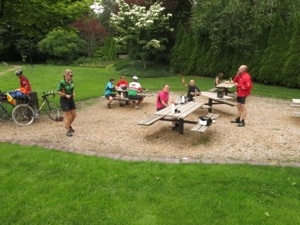 It was a bit cool and cloudy as we left, pedalling through the farmlands of the Fraser Valley. Soon we were starting to climb as we got closer to the mountains. Our lunch stop was in a beautiful little park in Agassiz. Naturally PB&J sandwiches were on the menu.