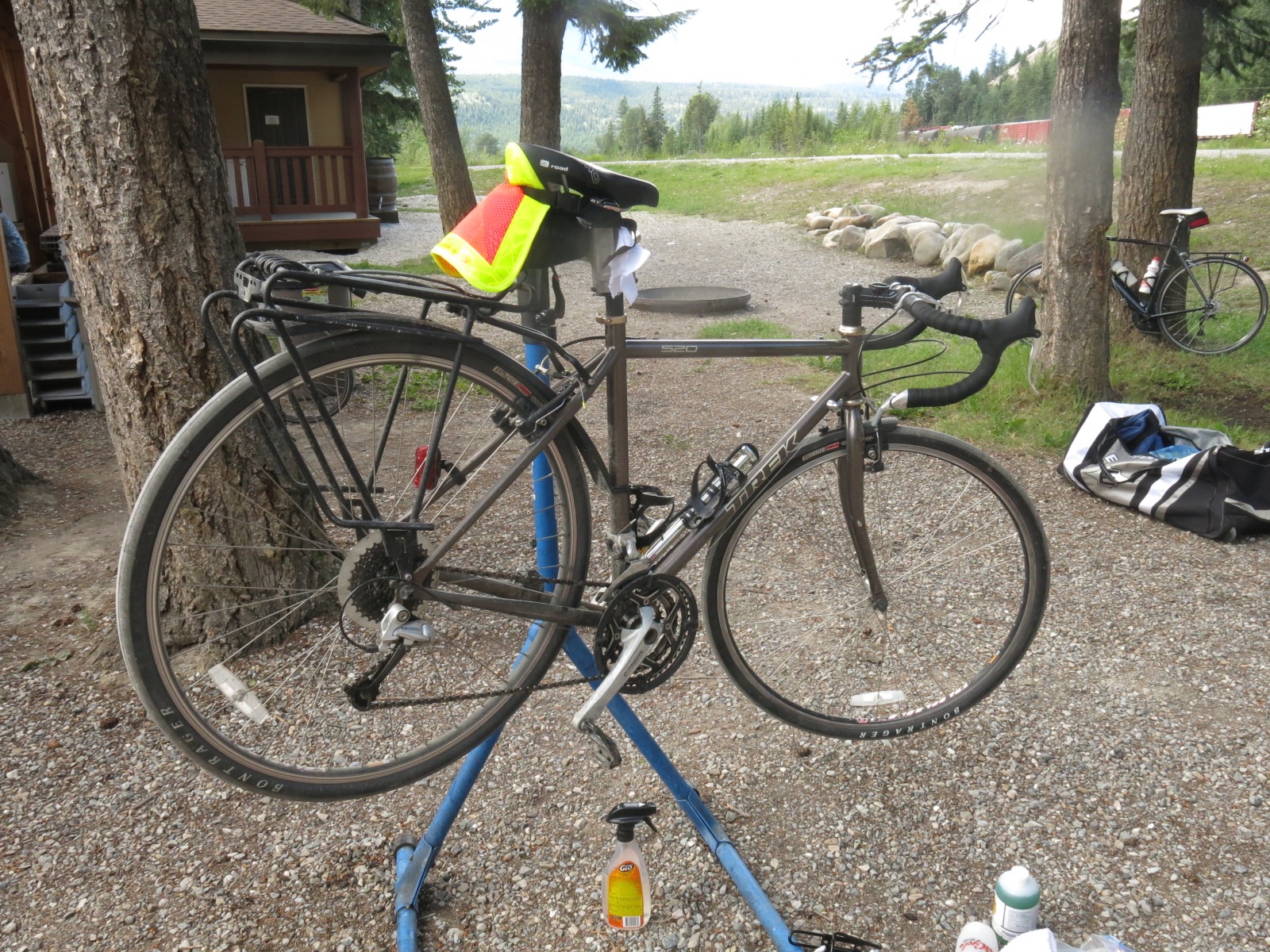 Back at camp it was bike cleaning/maintenance time. After riding in the rain a couple of days this week the chain needed a good cleaning and lubrication. I used the opportunity to mount my new water bottle cage. Just as I was finishing up the wind picked up and it looked like rain was imminent. I raced back to the tent and got my laundry off the line just before the first few drops of rain started to fall. And now I find myself under cover as the rain pelts down, the lightning flashes and the thunder roars. Hopefully the downpour will not last too long. In any event it will be a good test of my tent’s waterproofing.