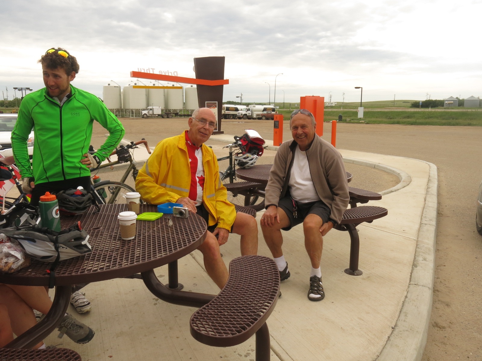 We were underway by about 7:15. In Cereal we stopped at an A&W along the highway where I had a hot chocolate to accompany my first PB sandwich of the day. While we were sitting there a fellow walked up and tapped Michel on the shoulder. John and Michel used to work together and he was on his way back from their farm to Calgary. He had figured out roughly where Michel might be and when he saw a bunch of bikes he stopped in. Michel was completely surprised.