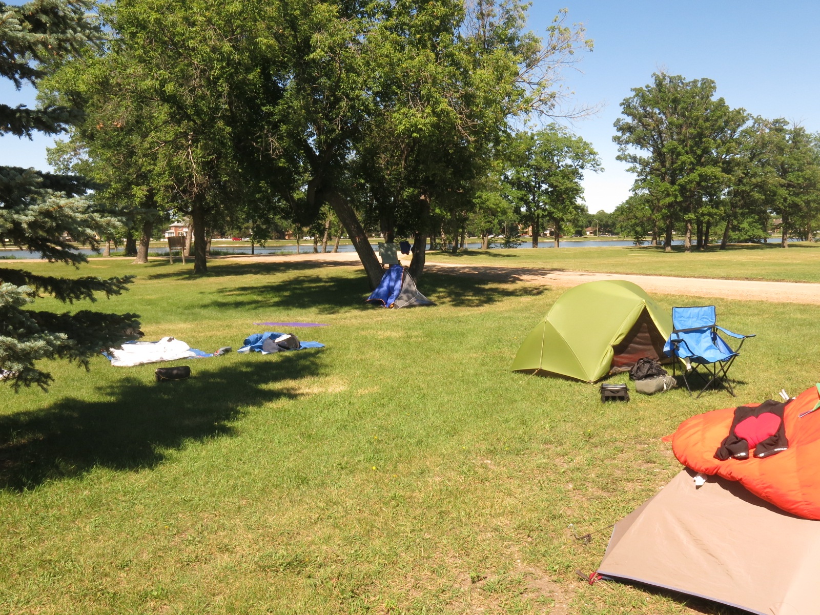 Portage La Prairie was a nice town to ride through. Our campground is on an island at the fair grounds – a very nice area. With the tent up I had time to relax in the sun for a while before supper.