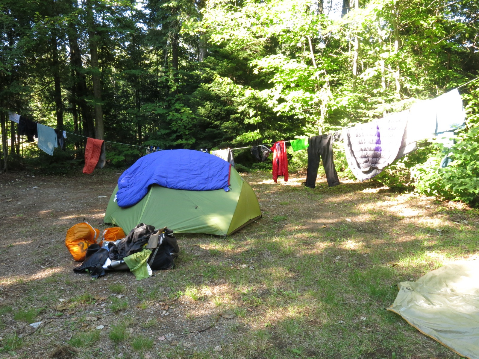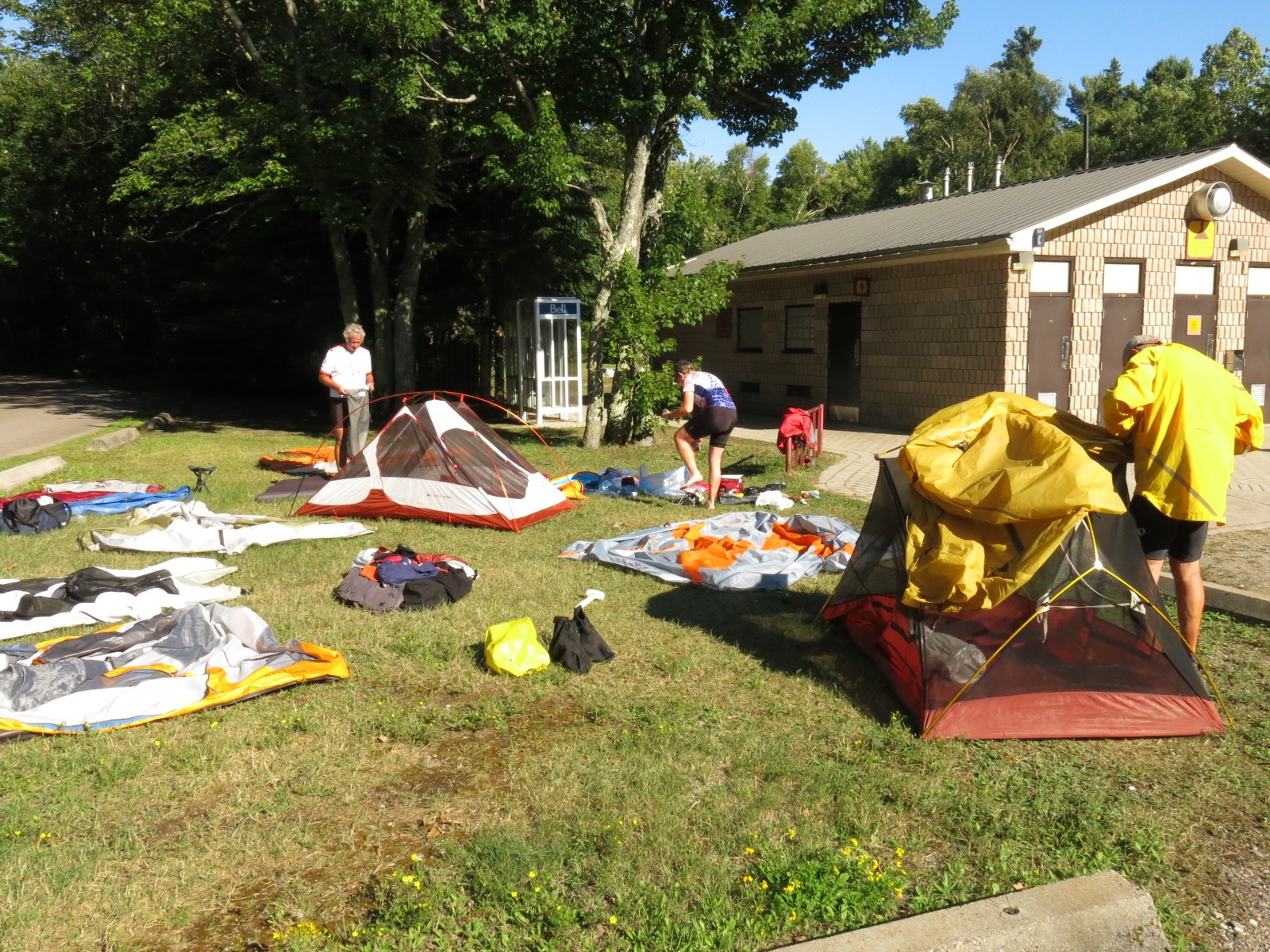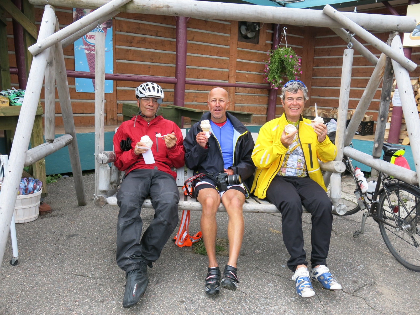 The “tourist trap” was indeed open, teeming with visitors, and just half a kilometre past the entrance to our campground. Even better, they had multiple flavors of hard ICE CREAM!! Several other riders arrived shortly after we did. As I sat on the swing with Jacques and Danny, eating my ice cream, we could see blue sky starting to appear above. By the time we got to the Pancake Bay campground the sun was out and it was getting warm. The sun was just the medicine our group needed. Not only did it lift our spirits but it allowed us to dry out our stuff. By dinner time everyone was in a good mood.