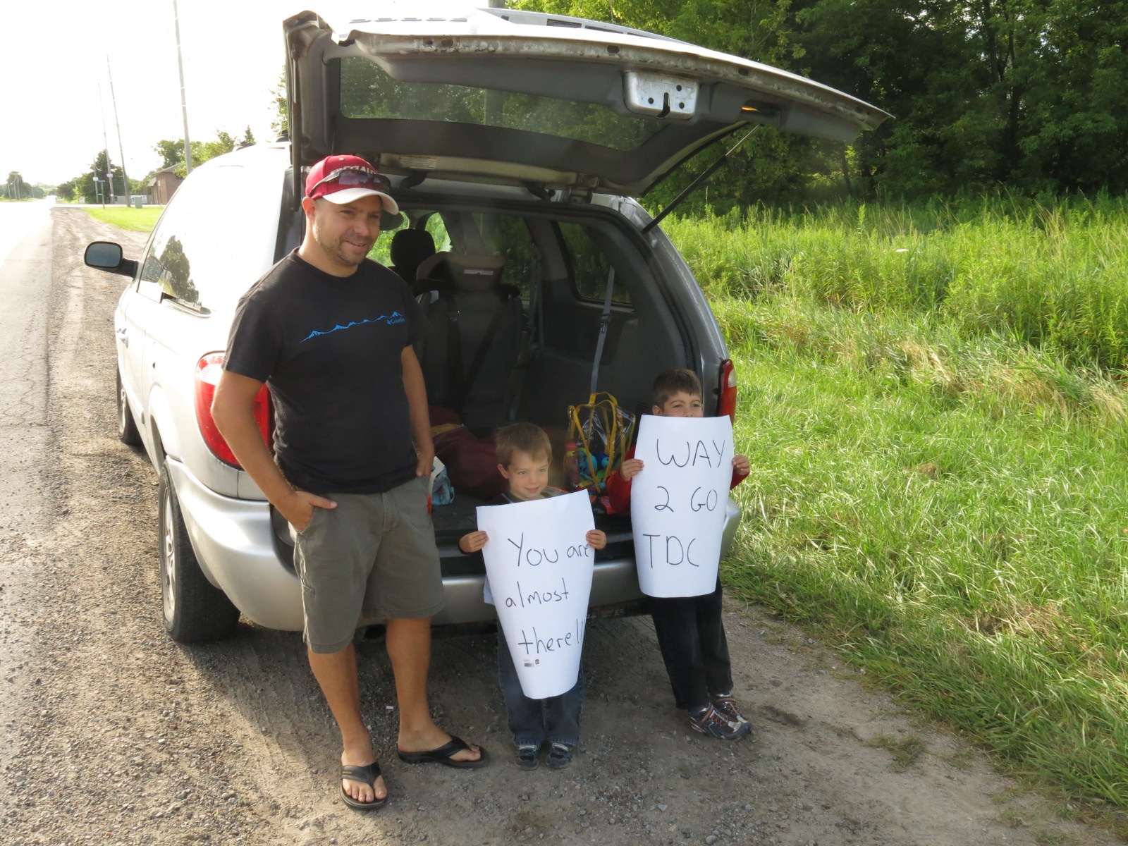 By 7:15 we were making our way out of the campground and through Tottenham. A little over 20 km into the ride we saw an SUV parked at the side of the road with the back open. Two little kids were holding up signs saying “Way 2 Go TdC” and “You Are Almost There”. We slowed to a stop just as the fellow shouted that they had Timbits. The fellow, Ryan, rode the TdC in 1993 when he was 17 years old. We chatted with him for a bit before moving on.