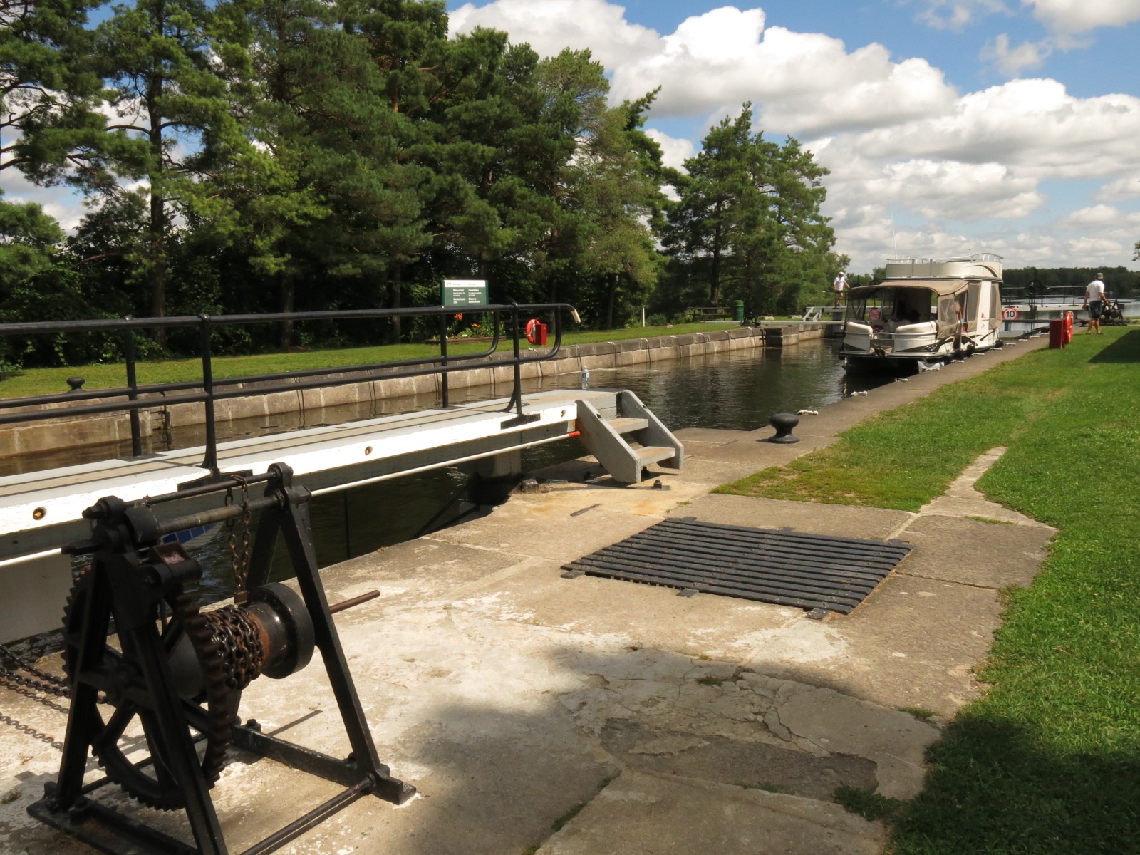 As we leave town we start riding along the Rideau Canal. A short distance from Merrickville we encounter our first set of locks at Burritts Rapids. They are just opening the upper gates, cranking by hand, and two boats are leaving the locks as we get there.