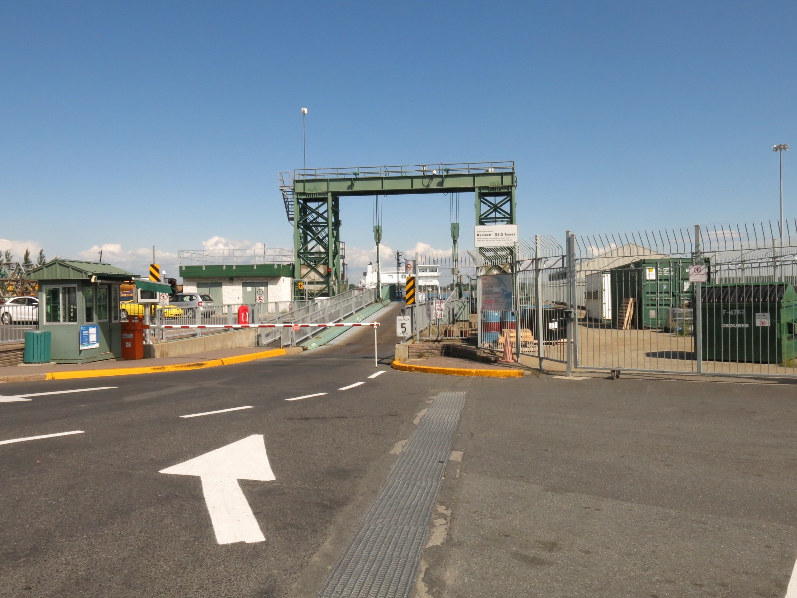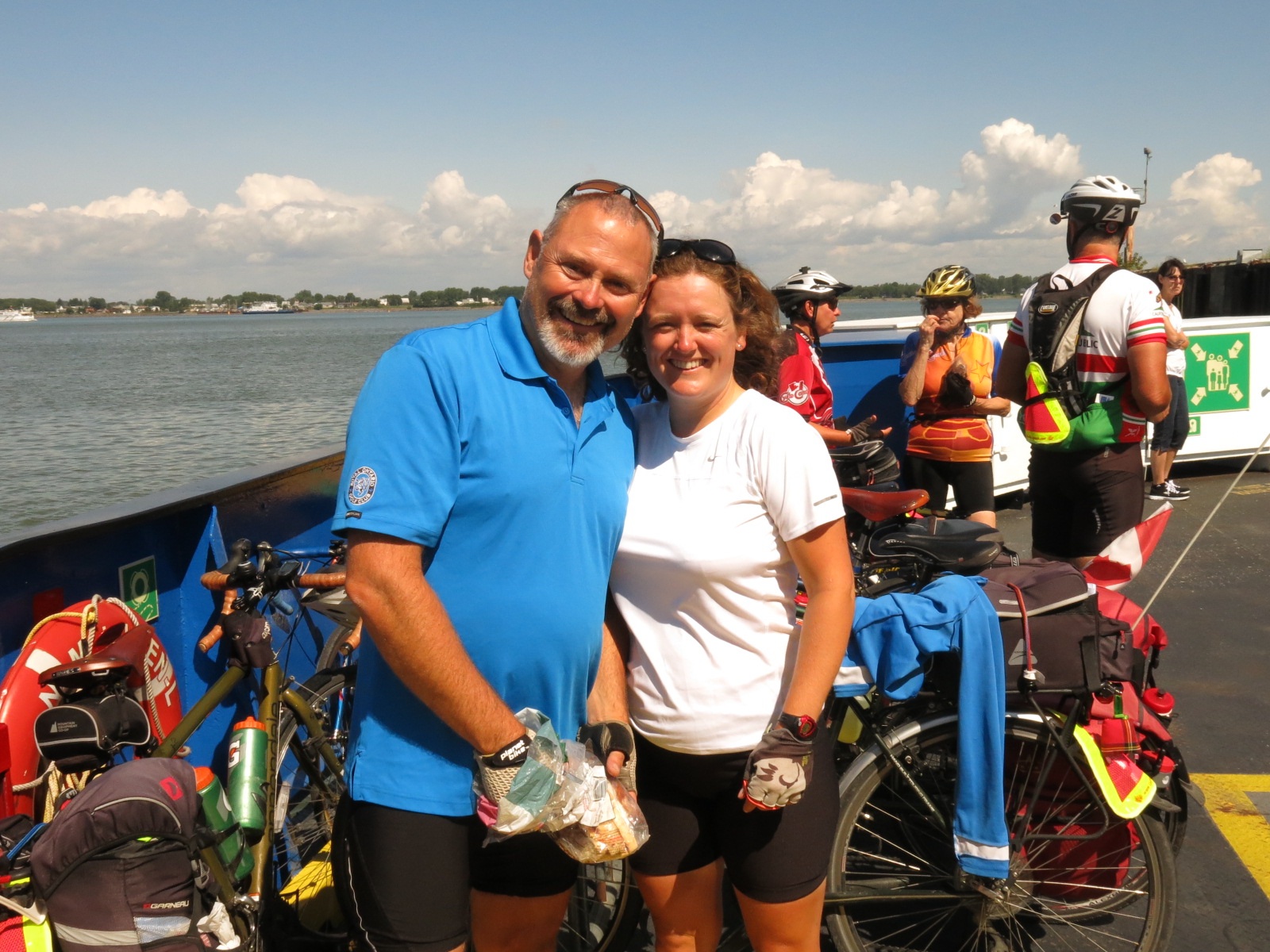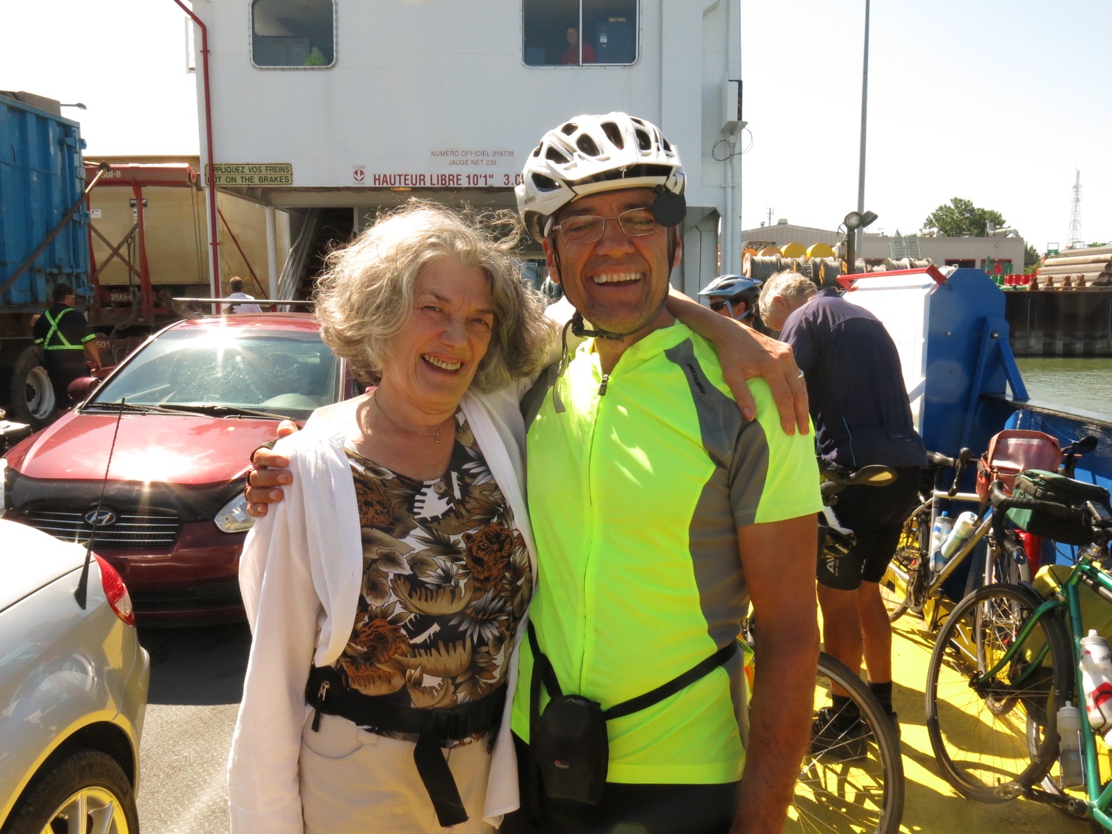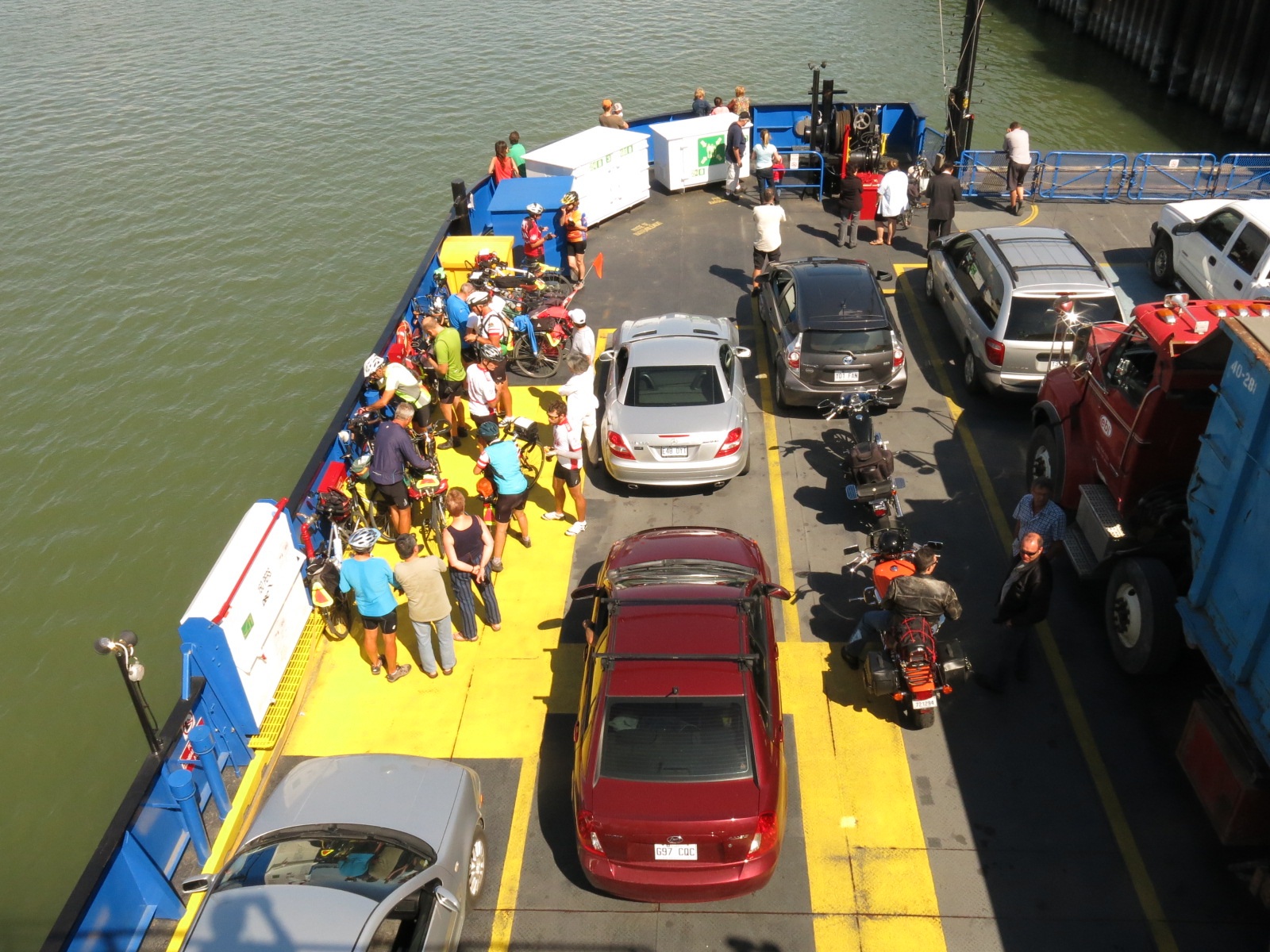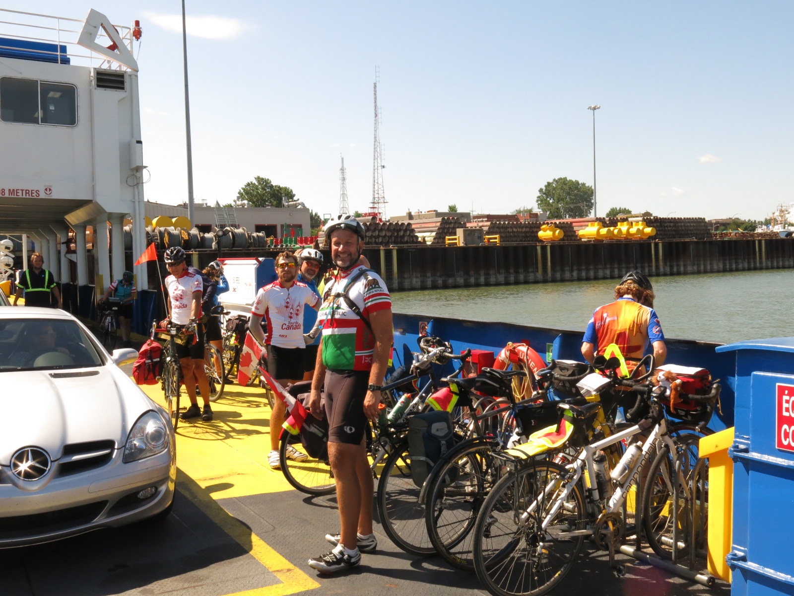 A few blocks from the restaurant was the ferry to St. Ignace. We bought our tickets and went to the head of the line to wait for the next sailing. A few minutes later a large group of our riders arrived. Just after we boarded Jacques got a big surprise when his sister and nephew got out of a car. I’m not sure exactly how she managed to catch the same ferry as Jacques. She had seen Adam apparently at the camp and got our route from him but the ferries run every half hour and he could have been on any one of them. Anyway he was pretty surprised.