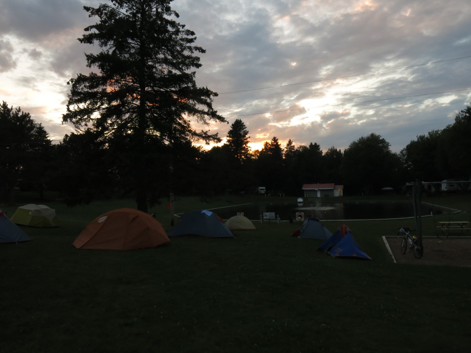 We wanted to get to camp early as we were on cook duty tonight. Beef Bougonione was on the menu and we knew it would take several hours to cook. We arrived in camp near Trois-Rivieres after a 137 km ride and got out tents up before we got hit with a downpour that passed quickly.