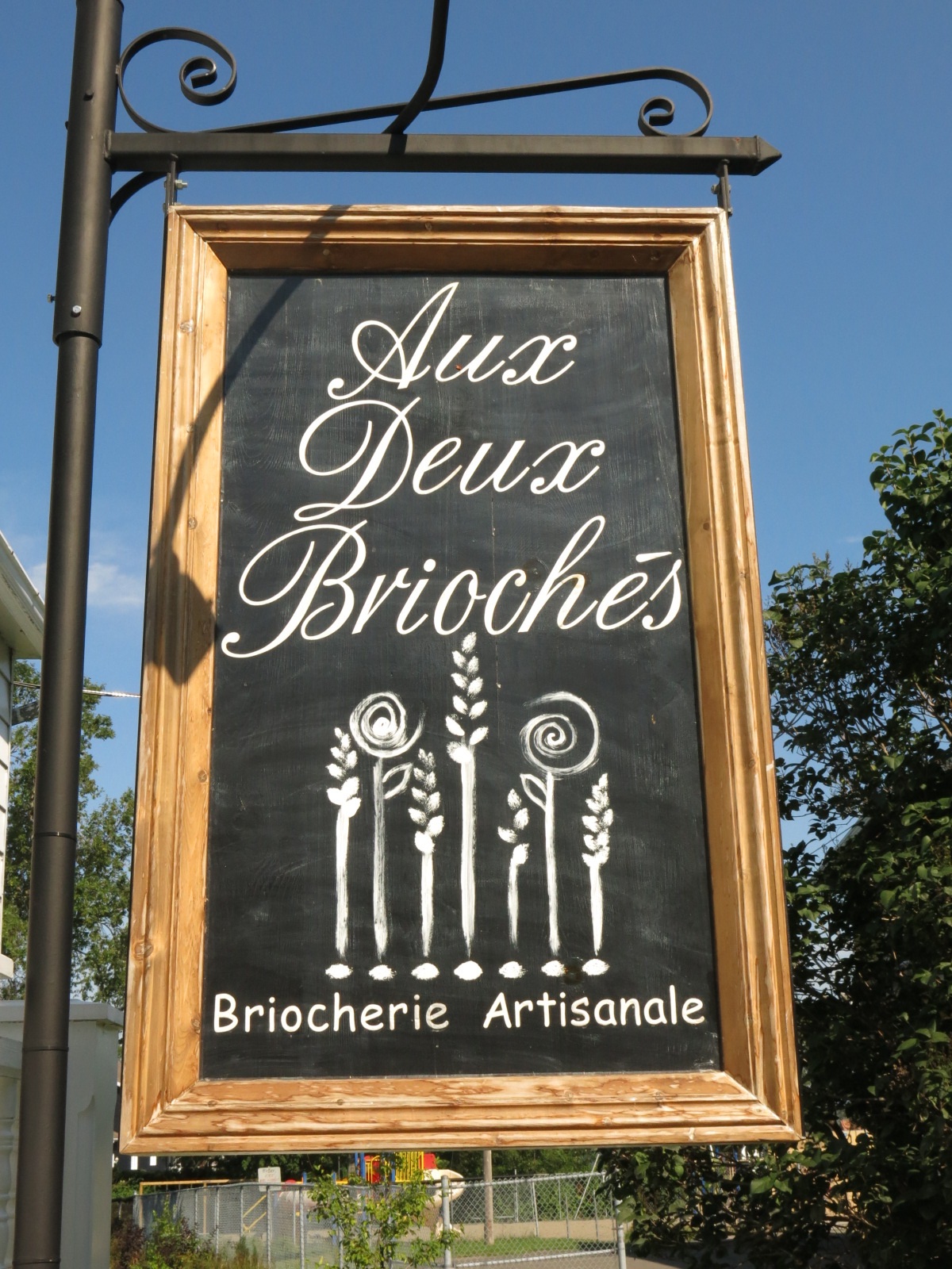The bike path continued for a ways past the ferry until eventually we got onto highway 132. The highway had nice wide, smooth shoulders and even better, a tailwind. We sped along until the village of St. Michel where we found a wonderful bakery, Aux Deux Briochés. We sat on the veranda and I enjoyed my cinnamon bun with blueberries and a double espresso. Elaine had the same only with tea instead of espresso.