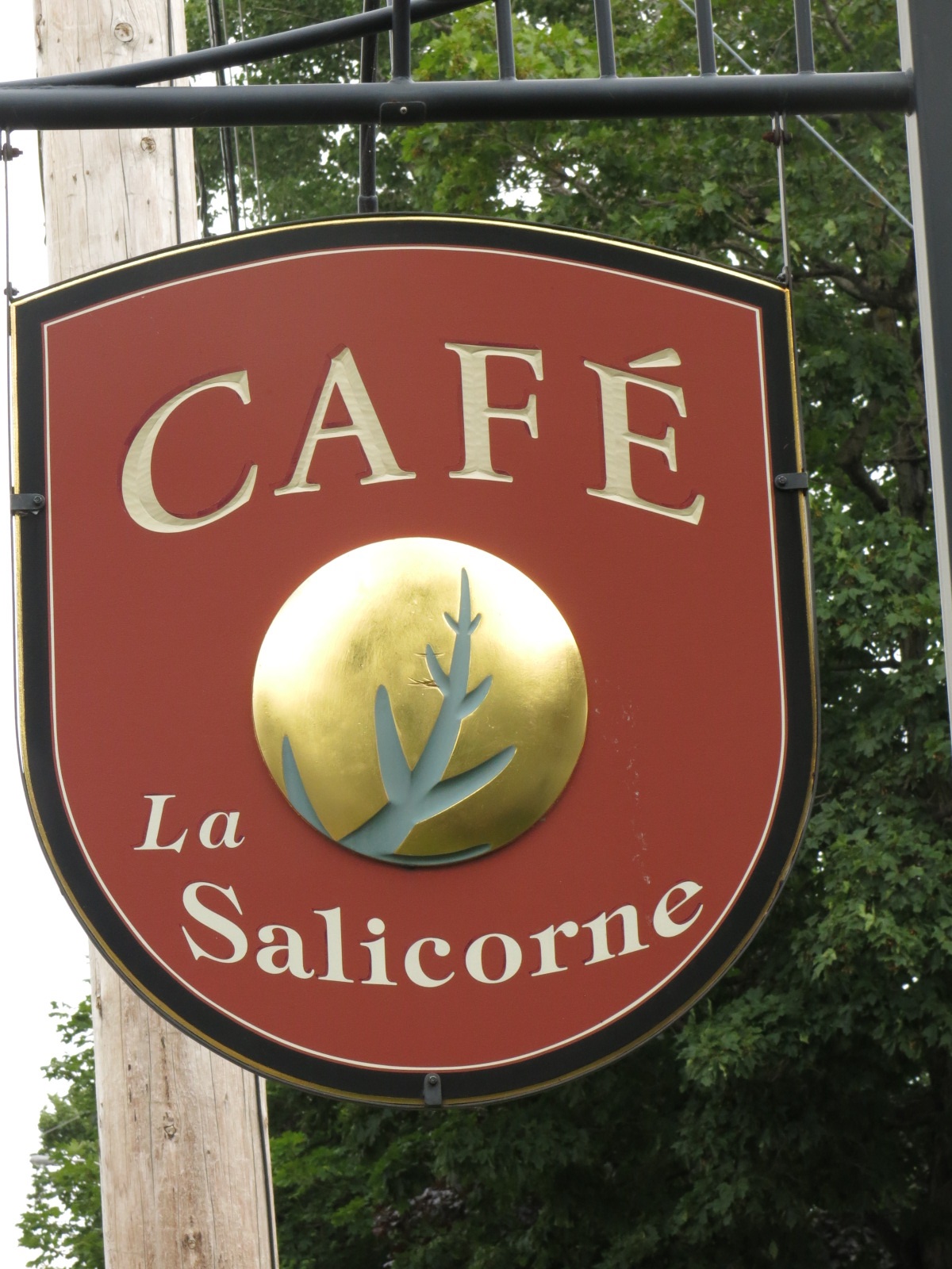 Returning to the highway we continued our ride through beautiful farm country alongside the St. Lawrence. The tailwind persisted to our enjoyment and in no time at all we had reached the 90 km mark. In the town of L’islets Sur Mer we found the Café La Salicorne for lunch. Located in a remodelled old house, the food was fantastic. I even had a glass of red wine to go with my meal.