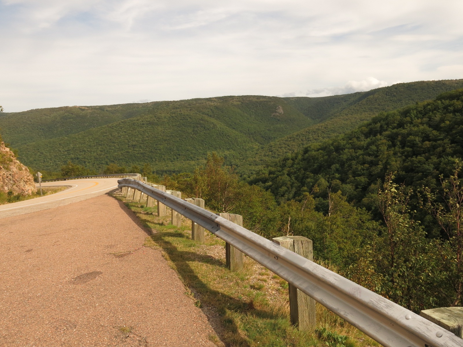 The ride along the Margaree River to Margaree Harbour offered beautiful views of the river and the farms nestled in the valley. From the harbour we turned north to start our ride along the coast. This side of the island seems to be heavily of Acadian descent with the red, white, and blue Acadian flag displayed on many homes and businesses. North of Cheticamp the road started to get hillier with longer and steeper hills. The tops of the hills offered some stunning views out over the shoreline.