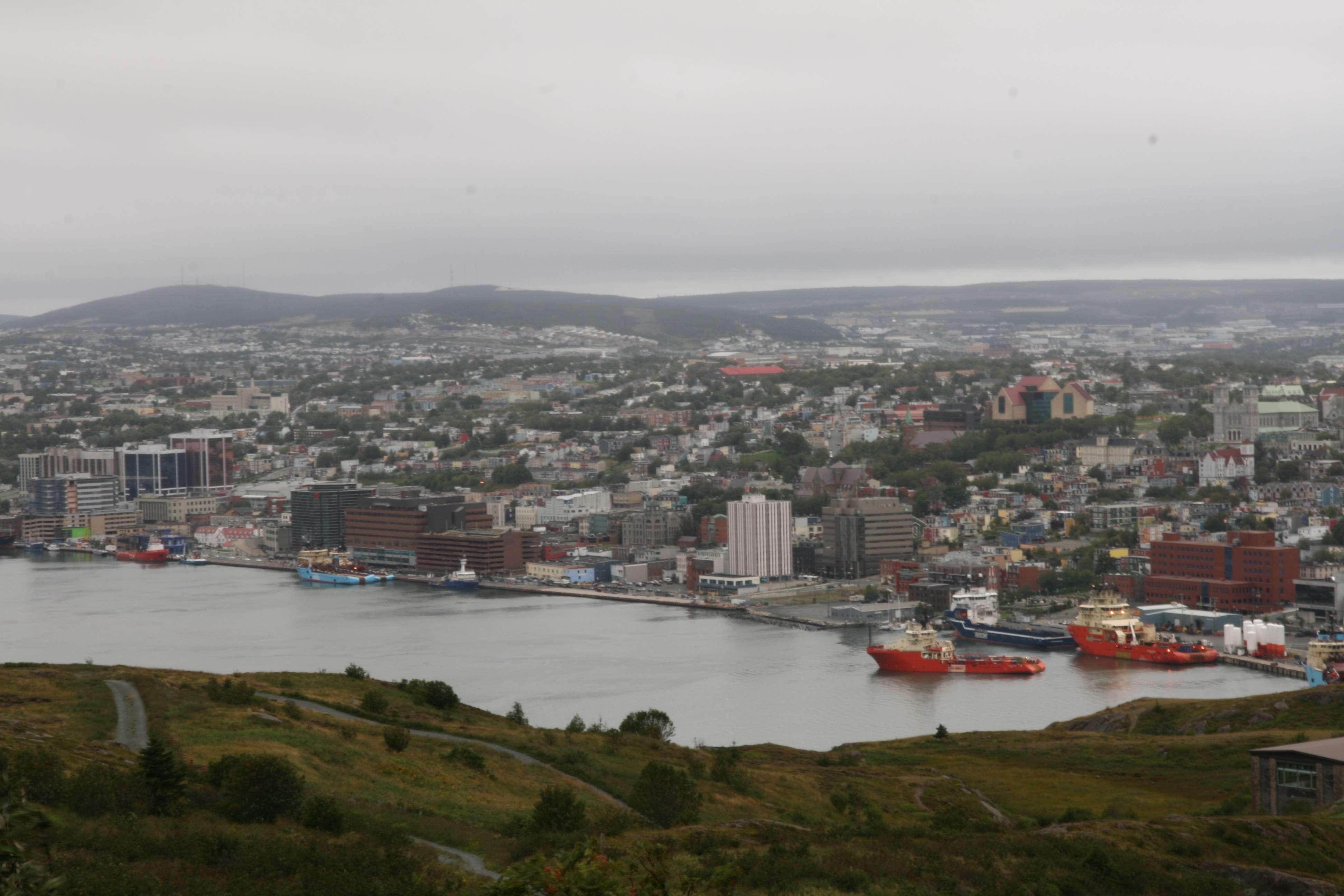 From Cape Spear we could make out Signal Hill in the distance. Even though it was cloudy, it was clear enough that we decided it would be nice to see the view from Signal Hill when it wasn’t shrouded in fog. So off we went, back through St. John’s and up the hill we had struggled to climb only a day before. The view from the top of Signal Hill, even on a cloudy blustery day, is quite stunning.
