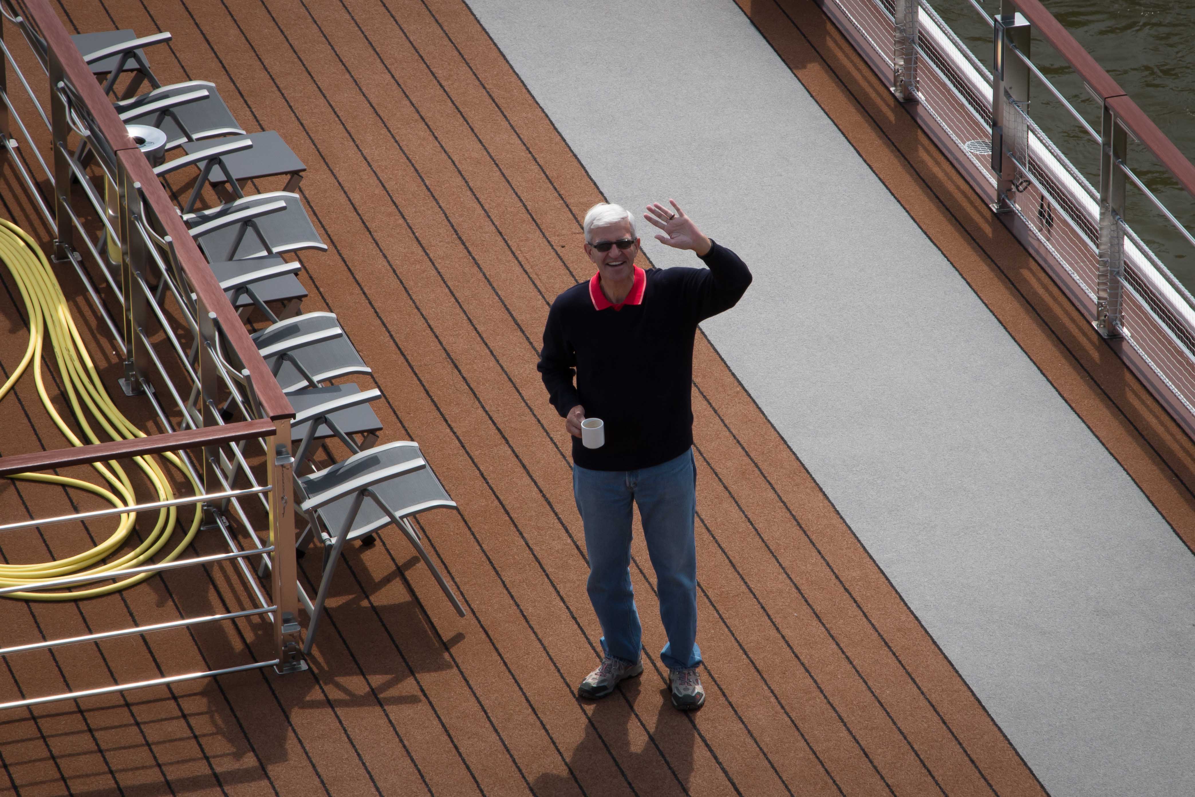 Following our walking tour we returned to the Skadi (our boat) for lunch. While there were shuttles taking passengers back to the downtown area, Rick, Linda and I opted to walk. It turned out to be a good choice as it was a beautiful afternoon and only about a 20 min walk. As we crossed a bridge, Linda spied my friend Wayne strolling on the top deck of the Viking Delling. Wayne and Jean are doing the same trip but on a different boat. We hollered down to him then went down to let him know our plans.