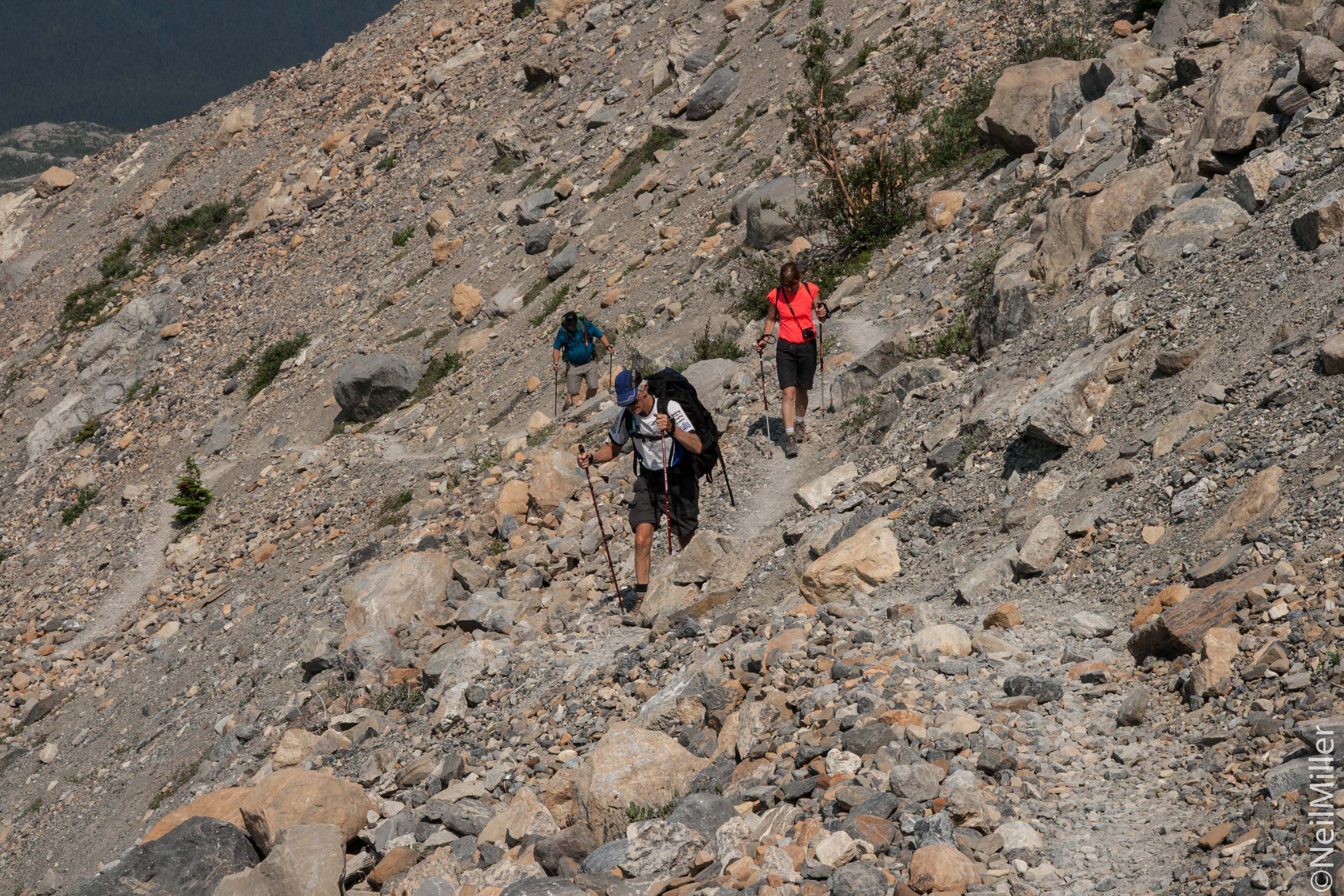 Earlier, while we were having lunch at Kinney Lake, a park ranger had stopped by and had suggested, that to avoid the heat on the climb out of Whitehorn, we might want to get an early start. Taking her advice, we were on the trail again by about 7:30 the next morning. Living up to its reputation, the 4 km climb after our overnight stop was fairly strenuous. While it was warm enough as it was, we were happy that we had not delayed our start until later in the morning when it got quite hot.