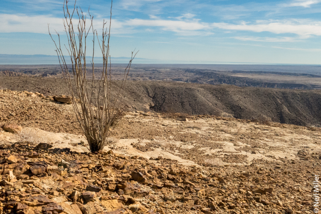 For the most part, the trail up to the mine site follows an old roadbed. Along the way we explored one short slot canyon that was blocked partway into it by boulders. There is no equipment or buildings marking the site of the old mine itself however the area offers an incredible view towards the Salton Sea.