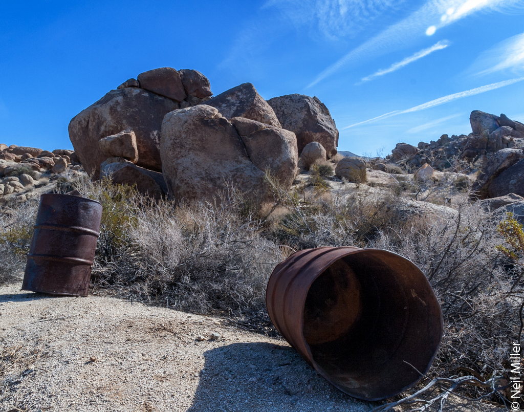 Our hike started by skirting around a patch of cholla cactus to avoid any risk of their pesky spines being embedded in our skin. After a short hike along a wash we started scrambling over boulders in the first of a series of dry waterfalls. Over the next hour and a half or so we continued working our way upward through picturesque canyons, boulder-strewn dry waterfalls, and washes. Several overturned empty, rusted, fuel drums indicated that we had arrived at the site.