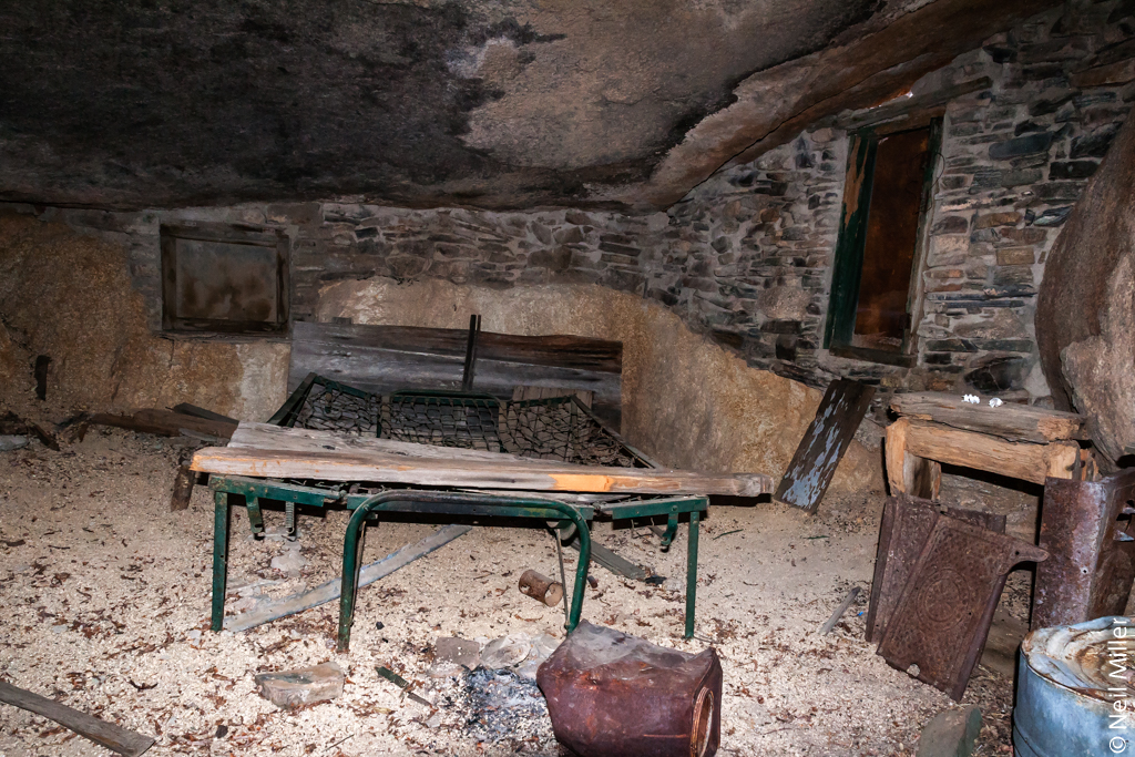 Cary’s abode was actually built in a space under two huge boulders. Open spaces had been bricked in. The wooden door was no longer attached but inside there was still a little wooden shutter covering one of two screened in windows. The windows and door would have provided some degree of cross-ventilation if any wind was blowing. The interior of the home was reasonably spacious, containing a rusted old bed frame, shelving, and various rusting knick knacks. A chimney pipe through the side wall provided evidence that there must have been a stove at one time.