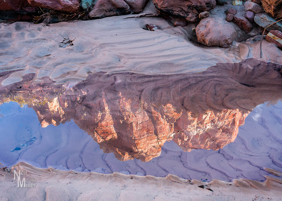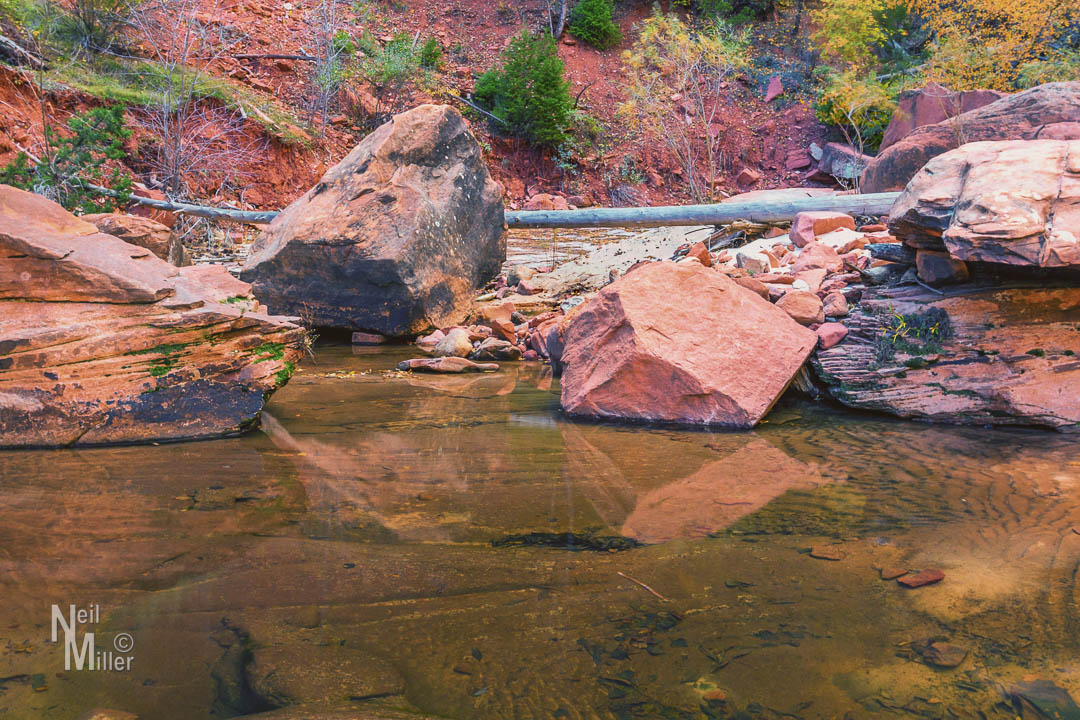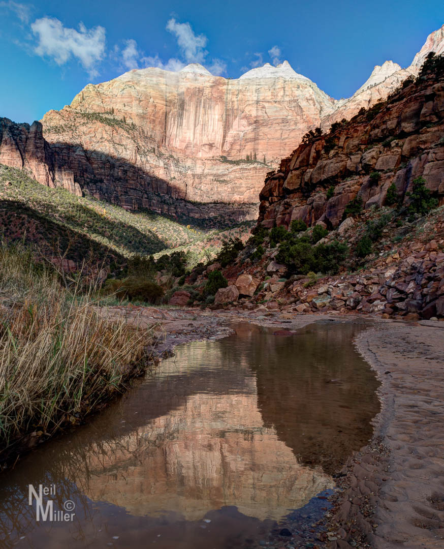Sunrise on our final morning, viewing the Court of the Patriarchs from river level, was somewhat disappointing. While there was briefly a bit of color on top of one of the peaks, it didn’t last long and really didn’t develop into anything remarkable. Following sunrise, though, we did find a location for some great reflection shots.