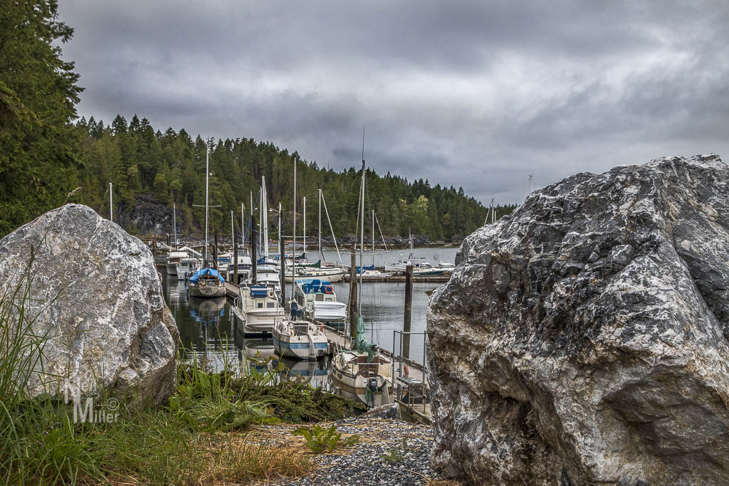 Day 5 started with rain. While refuelling the boat I regretted that we hadn’t done this the afternoon before when it wasn’t raining. Soon we were on our way in wind and rain out of Jervis Inlet and up Malaspina Strait to Sturt Bay towards the north end of Texada Island. To our delight it was a beautiful little bay. The local yacht club has a dock reserved for transient moorage which is where we tied up. About a 20-minute walk from the Marina is a well stocked grocery store which is a great spot to re-provision. While there we learned that one of the local landmarks, the hotel, had burned down the week before. With it went a pub and restaurant which had a great reputation.
