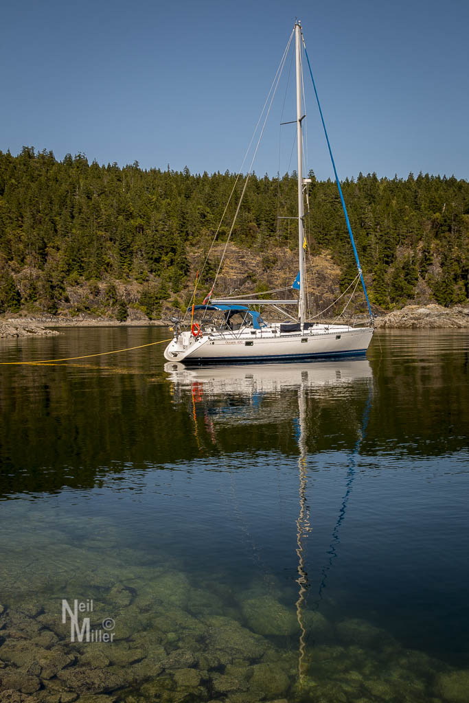 Our route on Day 6 took us to the end of Malaspina Peninsula and into the area known as Desolation Sound. After rounding the peninsula’s tip we proceeded down Malaspina Inlet, then up Lancelot Inlet to Susan Islets. Given that this sailing trip was a birthday gift to my wife for her last birthday, it only seemed appropriate that we would would visit this anchorage, given its name. Save for a few seals and some mergansers, we had the cove to ourselves.