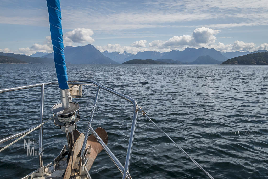 In spite of a few showers overnight, Day 8 dawned with partially blue skies. With only a short distance to go we were in no big rush to leave. A little after 10 we had hoisted our anchor and set off for Refuge Cove, about 10 miles away.