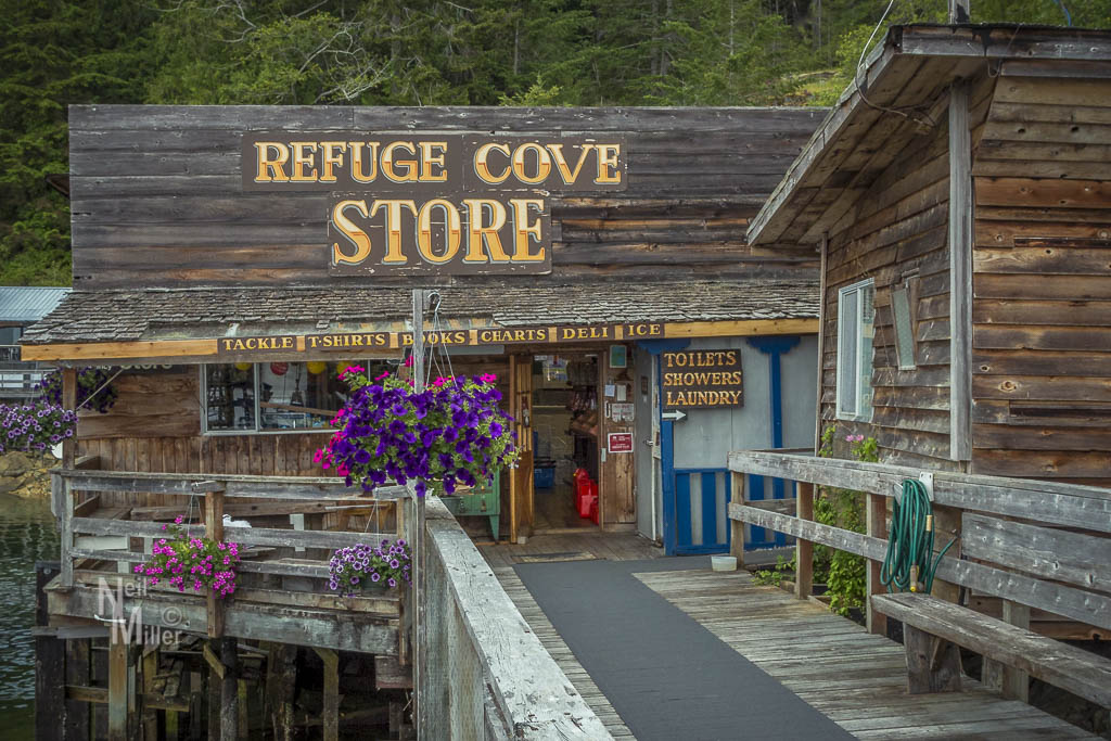Refuge Cove is a bit of a funky little place. The area around the harbour is owned by a Co-op who lease space back to some private businesses. Basically you can venture no further than the top of the dock where the General Store is located. The rest of the area is private. At this time of year only the fuel dock and the General Store are open. The little restaurant and an art gallery were closed. The store was fairly well stocked for the few provisions we needed. As well, for 5 bucks you could have a shower with no time limit – a welcomed experience after several days of anchoring out.