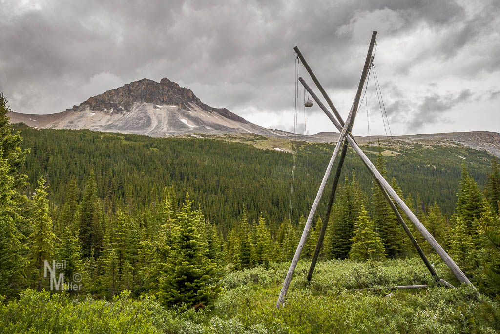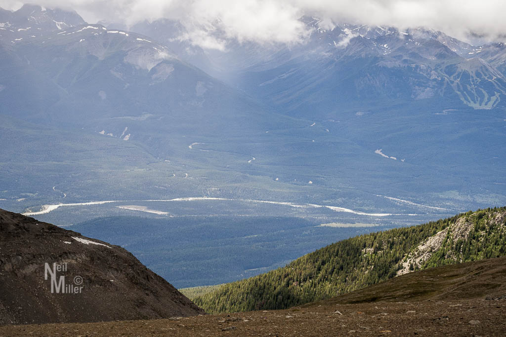 Our route took us along a ridge for several more kilometers before finally starting to descend towards Tekarra Campground. As we got down to the valley floor we had a brief encounter with a grizzly. I first saw the bear up ahead, crossing a stream. It angled off away from us, disappearing behind a ridge. By now we had our bear spray and bear bangers out and were watching for the bear to reappear. After a minute or so it popped up on the ridge about a 30 or 40 meters from us. I yelled and waived my hiking poles in the air and it turned and ambled away from us. We continued to watch the bear for several minutes to make sure it didn’t circle back, then continued our hike.