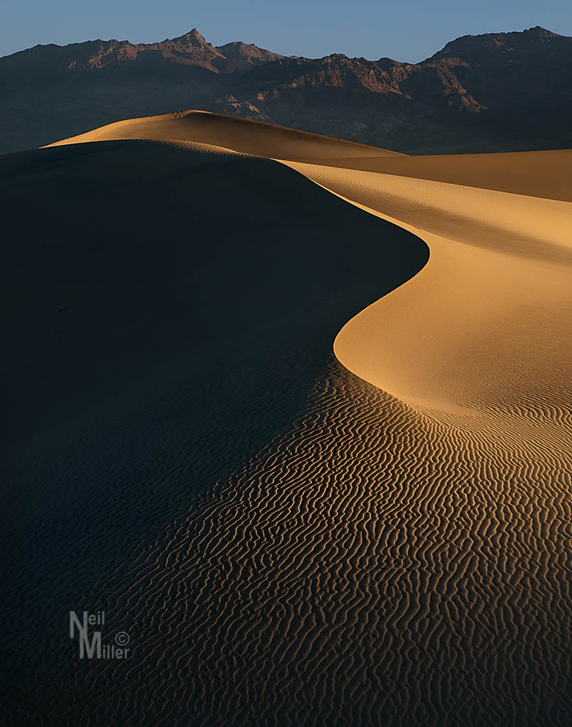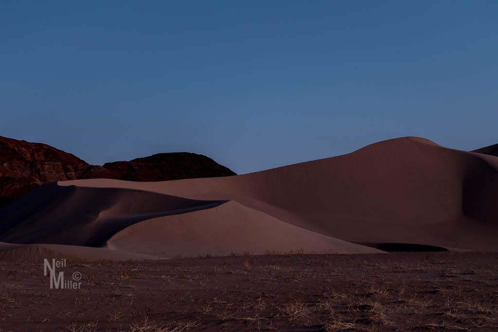 But luck was on our side. Overnight a windstorm blew through. We decided to try the dunes again at sunrise. We arrived early and hiked out into the dunes in the dark. Overnight the footprints had been obliterated and we were left with pristine dunes. Event better, the sun rose at such an angle to create the light and dark sides of the dunes that we wanted. Overall, a great success!