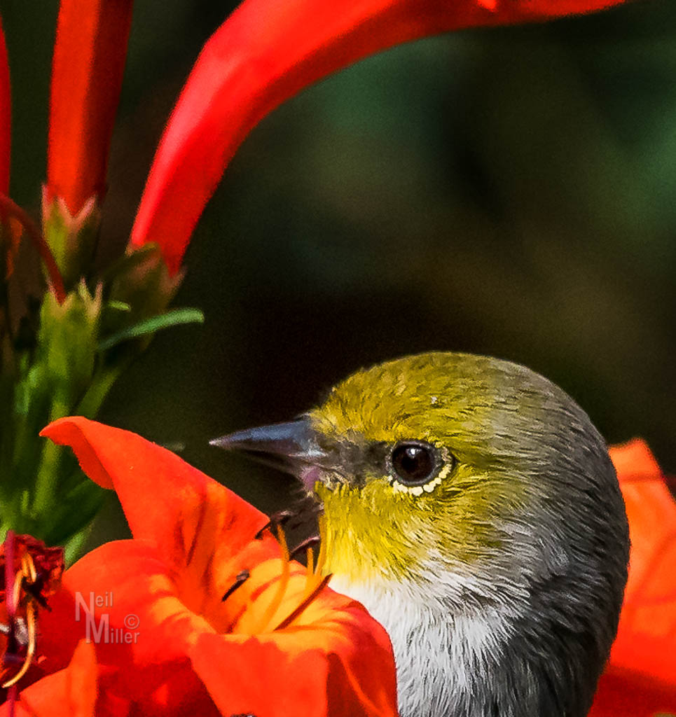 My backyard provides opportunities to practice photographing birds, such as this Verdin peeking at me from among the flowers.