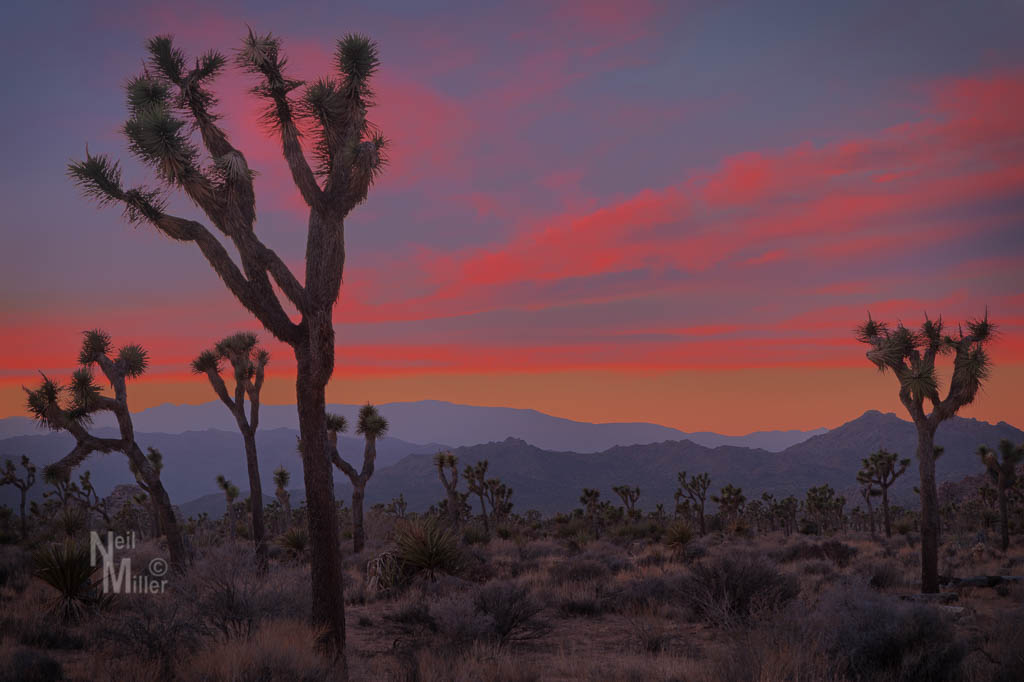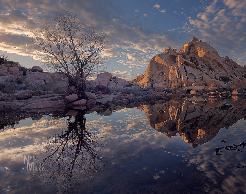 With a lot of rain in December, the pond at Barker Dam in Joshua Tree National Park filled up with water. In late December I photographed the pond at sunset and then a bit later during “blue hour” after the sun had gone down.
