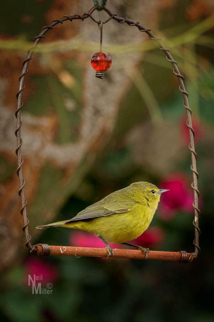 Then there was this Orange-crowned Warbler who was intent on checking out the Hummingbird feeder and swing.