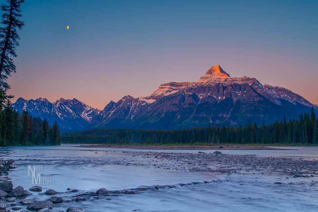 The first time was in early June, a trip that was partly a reconnaissance trip for a visit by a couple of my California camera club friends. My sunrise shoot along the Athabasca River was a bit lack lustre as there wasn’t a cloud in the sky. I did get a view of the moon, though, as the rising sun lit up the mountain peaks.