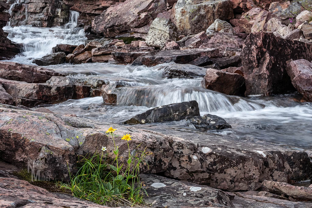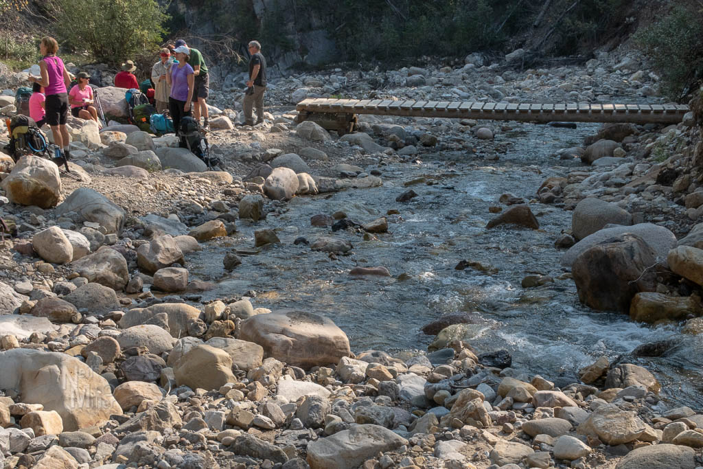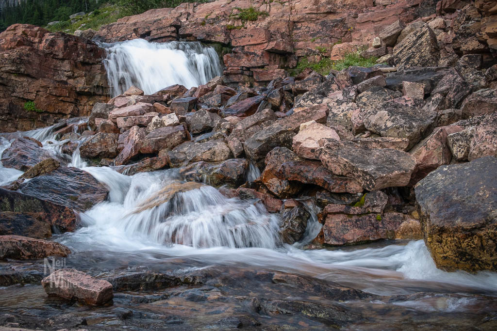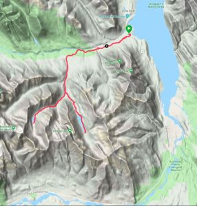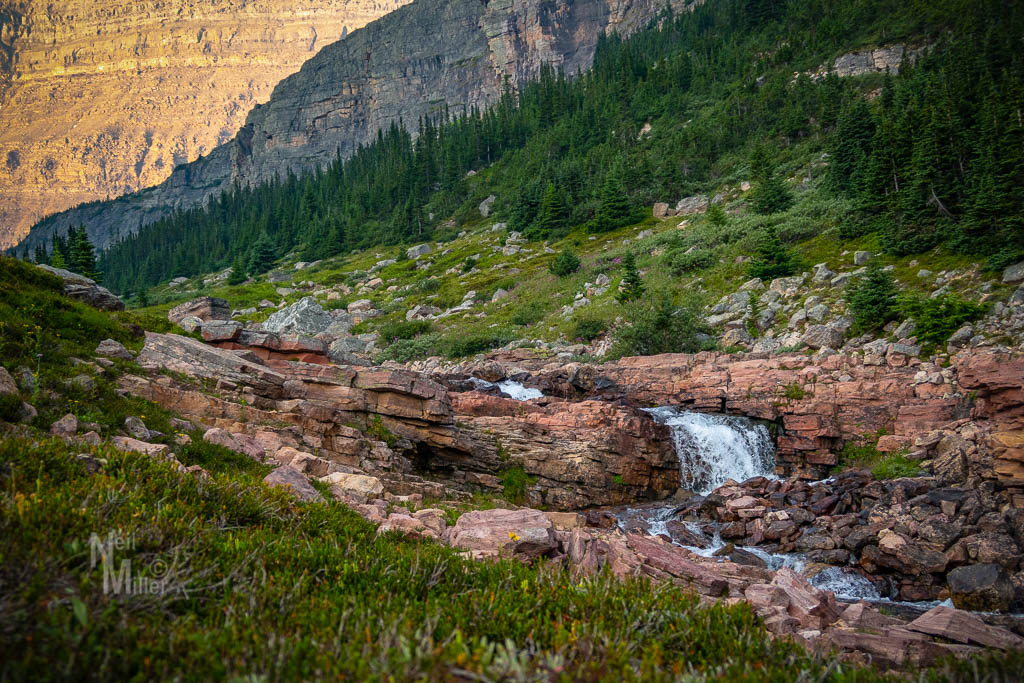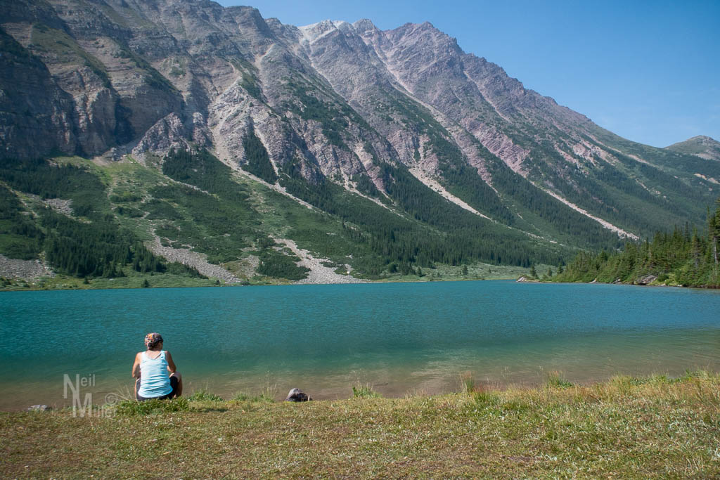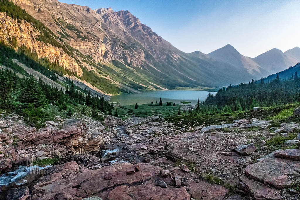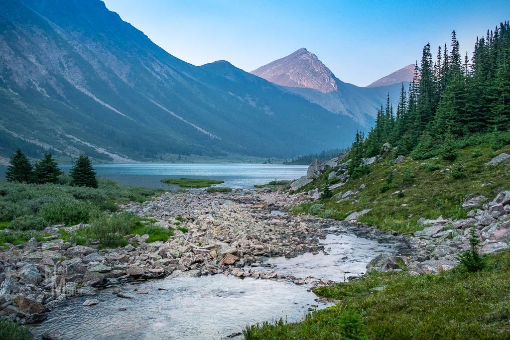 On Day 2 it was on to Lake of the Falls. At the confluence of Landslide Lake Creek and Entry Creek the trail forks. To the left is the trail to Landslide Lake. The trail to the right takes you over a little bridge and on to the start of the climb to Landslide Lake. The steepest part of the climb is about 1.5 km but feels much longer. The effort is worth it though as when you finally arrive at Lake of the Falls it is absolutely beautiful. The total distance from the trailhead to the lake is about 18 km with an elevation gain of about 1345 m (about 4200 ft).