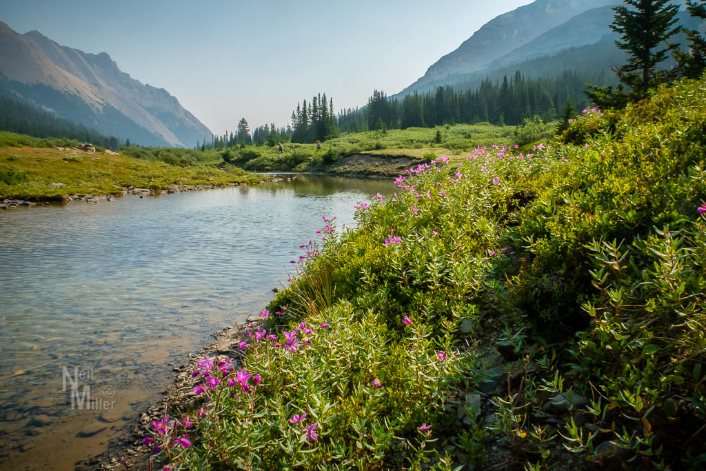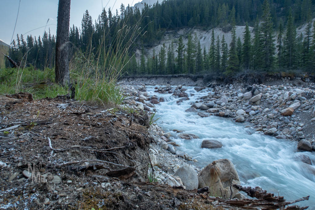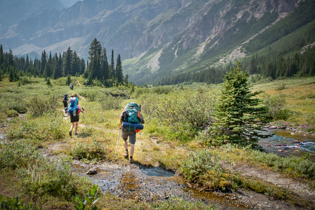 Our trip would take us first to Lake of the Falls then to Landslide Lake. Our group assembled at the Lake of the Falls trailhead near the Cline River on the David Thompson Highway, about a half hour drive southwest of Nordegg, AB. The first day’s hike of about 11 km took us about halfway to Lake of the Falls.