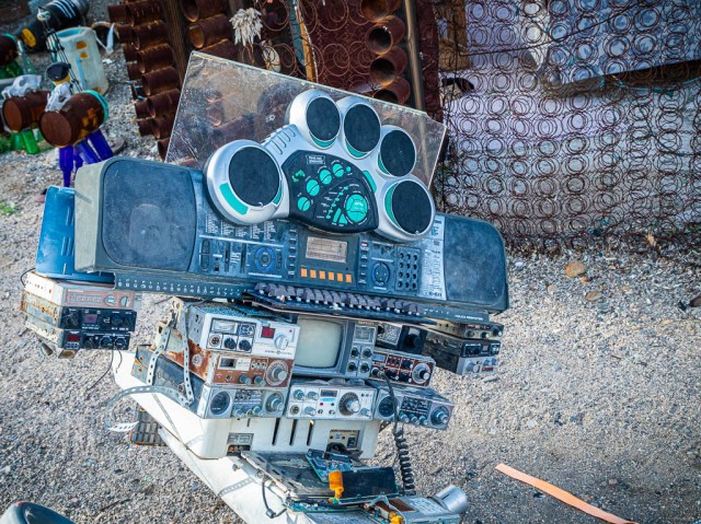 From Salvation Mountain we journeyed a short distance to East Jesus in Slab City. An old Marine base, Camp Dunlap, Slab City is a huge community of squatters who have set up camp on the concrete slabs left behind when the military buildings were removed. At first site, East Jesus seems to be a collection of junk and you wouldn’t be far off base. In reality, it is an amazing collection of Trash Art. It is truly an incredible place. The more you explore the more you discover. And the more you look at items the more you see as to what components it was created from. I don’t know how many times I stopped and just marveled at the genius and creativity that went in to a piece. While there is no admission charge, donations are gratefully accepted. And they will happily accept old junk that you want to donate – on a future visit you just might find it has been turned into a work of art.
