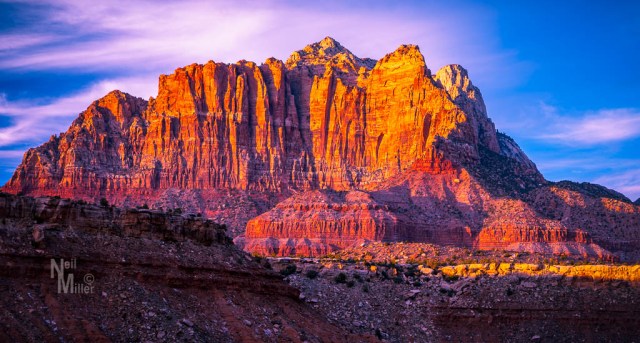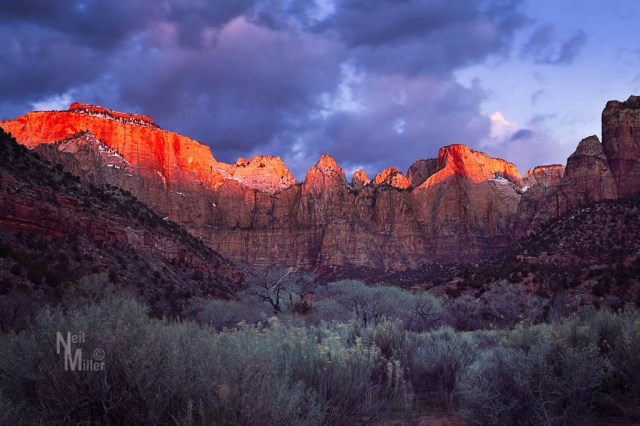Our first shoot in Zion National Park was of The Watchman. The last time we were in Zion we did the iconic shot from the bridge (see https://windaturback.com/2015/12/20/zion/ ). This time we shot it from along the river which gave quite a different point of view.
