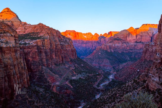 Early the next morning we donned our headlamps and repeated the hike to Canyon Overlook. While the hike is only about 20 or 30 minutes, the narrow spots on the trail can be somewhat intimidating in the dark. It is much more fun hiking out in the daylight. At the overlook we had a chilly, blustery wait for sunrise. With not a cloud in the sky it was not the most spectacular sunrise, but we did get some nice lighting on the tops of the Temple of the Virgins.