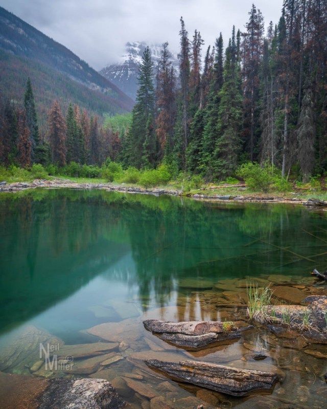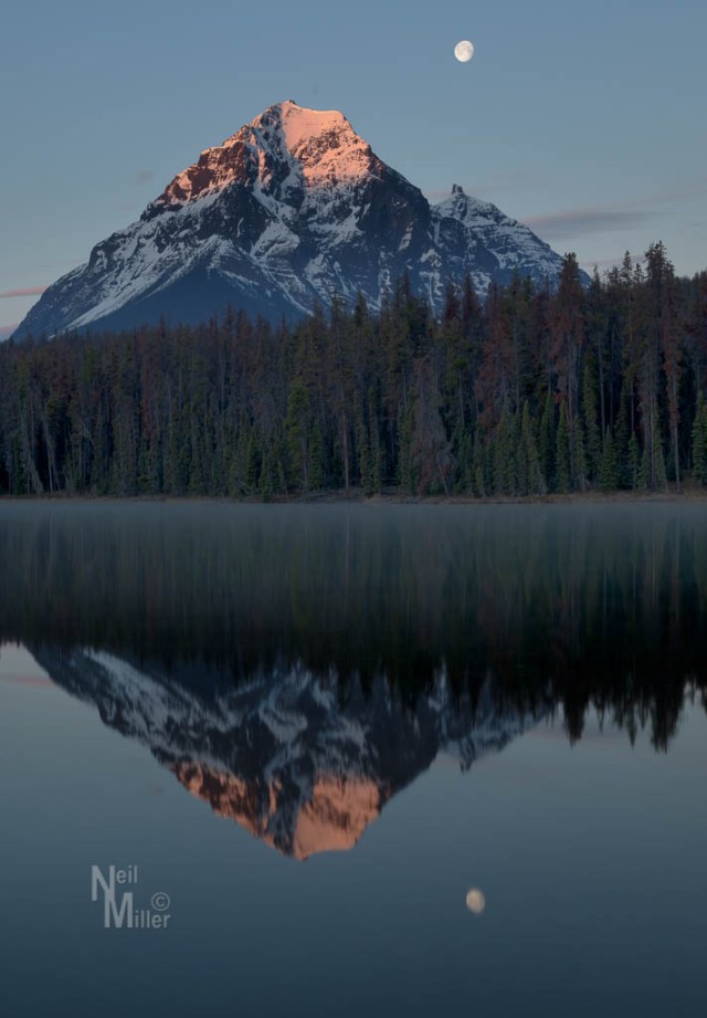 The first morning I got a couple of different views of Geraldine Peak. The first is from Leach Lake at sunrise and I managed to include the moon. There was even a little layer of fog on the water although it is hard to discern in the photo. The second was from along the Whirlpool River a bit later in the morning.