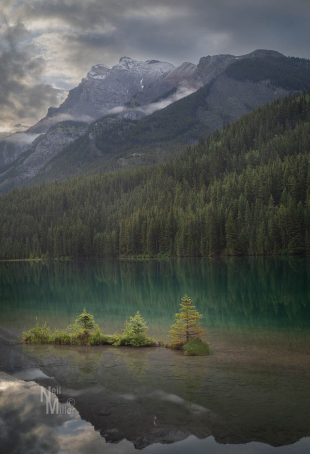 On the way back from camp I started to think about how I could look at things differently. One of the take-aways from the course I was working on was that if there wasn’t a “big” landscape to shoot, start isolating and looking for little scenes. As I was driving past Two Jack Lake I noticed some interesting meadows in the mountains across the lake peeking through the cloud and fog. I pulled over and with my 400mm lens started trying out several compositions. I ended up with this shot which I quite like.