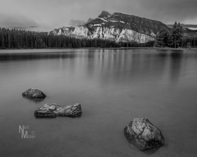 I loved how the light seemed to be lighting up the little “tree island” in the lake. The light didn’t last long so I returned to my original location. I composed my shot and waited. When it became abundantly clear that a spectacular sunrise was not going to light up the mountains, I decided to play a bit with long exposures. With very little color in the scene, when I took my photos I was envisioning them in Black and White. I think I ended up with something kind of nice. While the rocks aren’t perfectly placed (and I was not about to wade out and try re-positioning the rocks and my back!), they do lead your eye into the scene. The 13-second exposure really flattens out the water and leads to some nice reflections.
