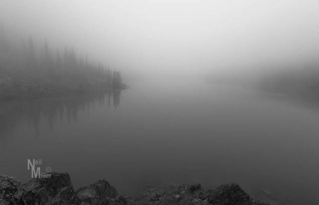 The next morning it was up again at 3:00 am for the hour-long drive to Moraine Lake. This time I was greeted with heavy fog and cloud. Still, I set up for a possible sunrise shot. As Blue Hour progressed, the fog started to lift revealing parts of the lake. This was my favourite of the fog shots.
