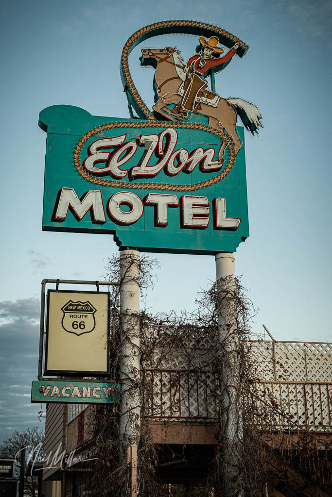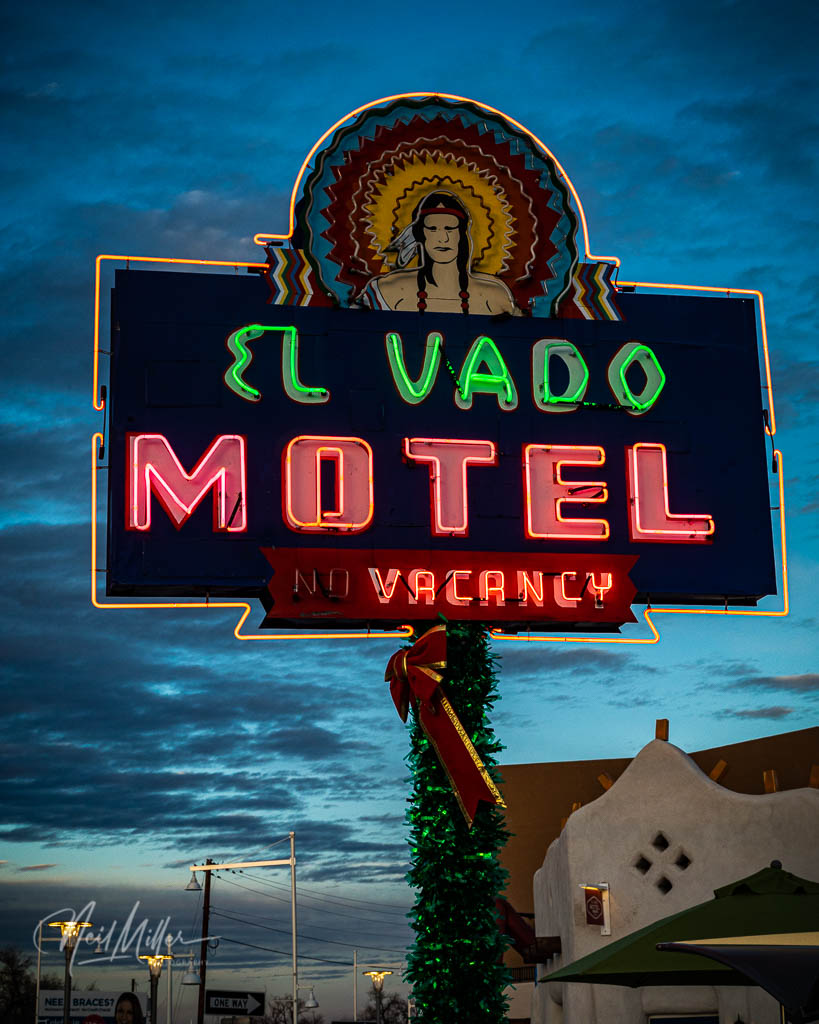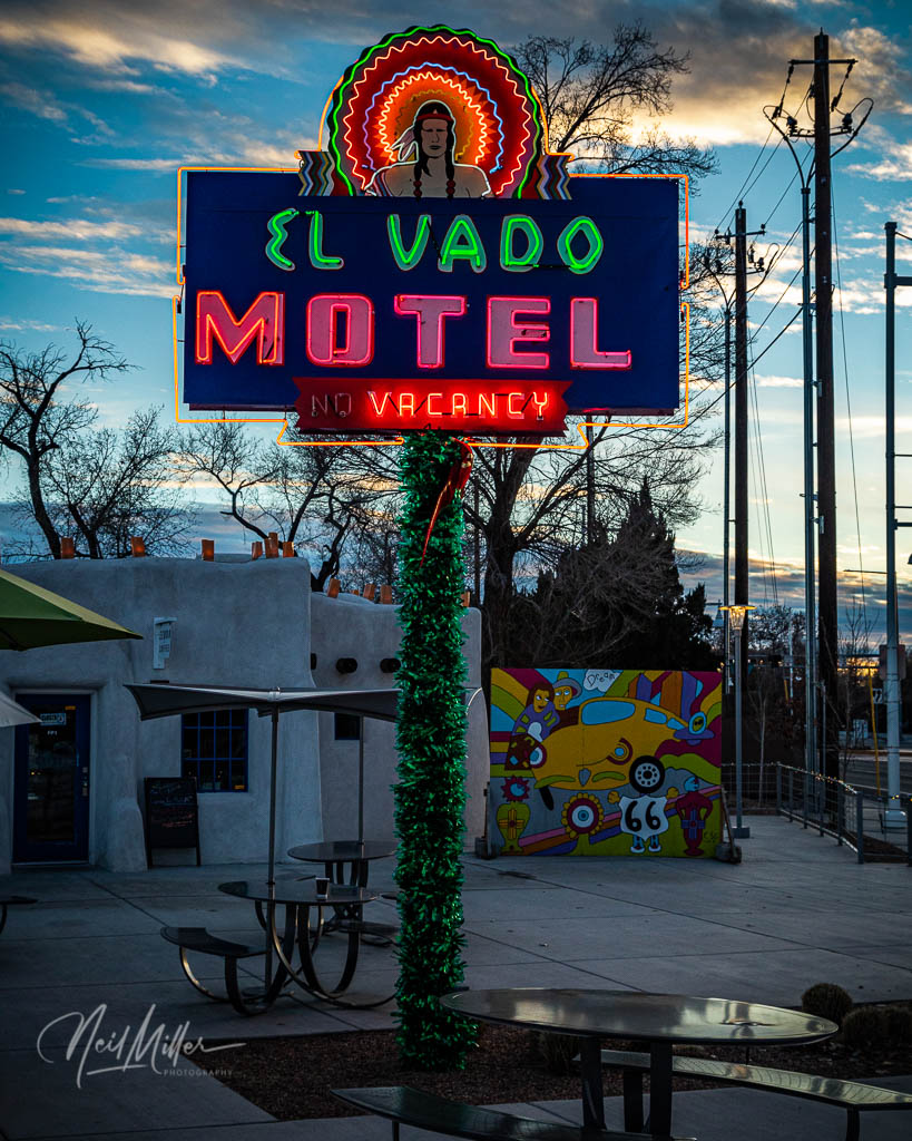 The drive along Route 66 through Albuquerque shows signs linking the city to its historic past. Its particularly nice in early evening when the neon signs start to light up.