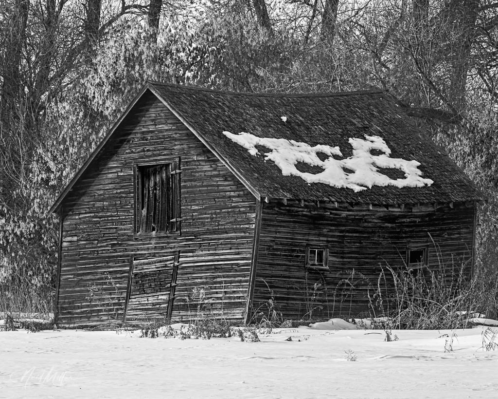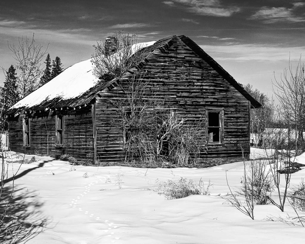 This old house has resisted, to some extent, the ravages of time. That passage of time is illustrated by the weathered exterior along with the trees growing out of the window, doorway and roof. The snow is devoid of tracks other than what looks like rabbit tracks leading towards the house.