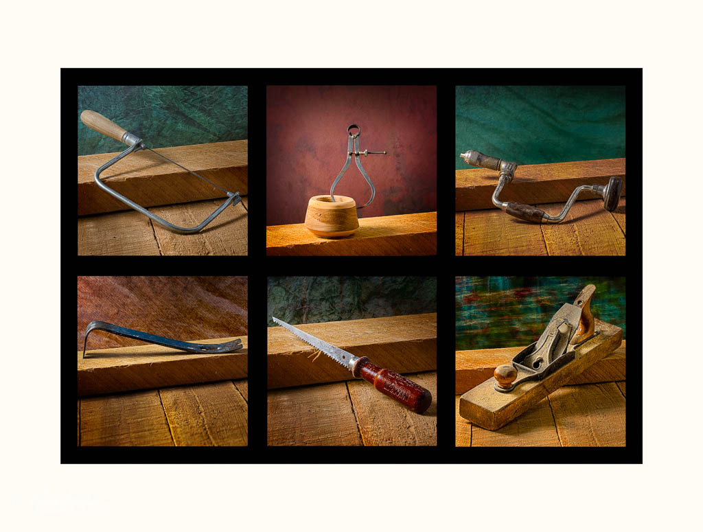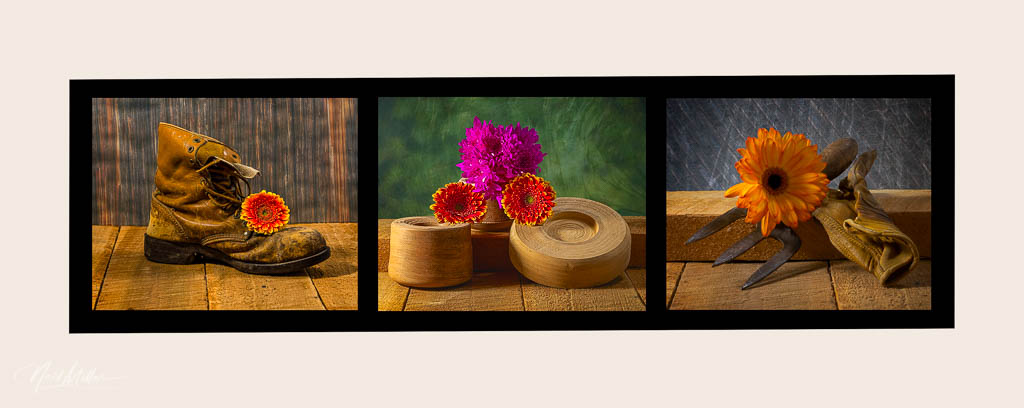 Over several days, I photographed flowers and tools in my workshop. After creating a series of images, I combined some of them into triptychs and grids.