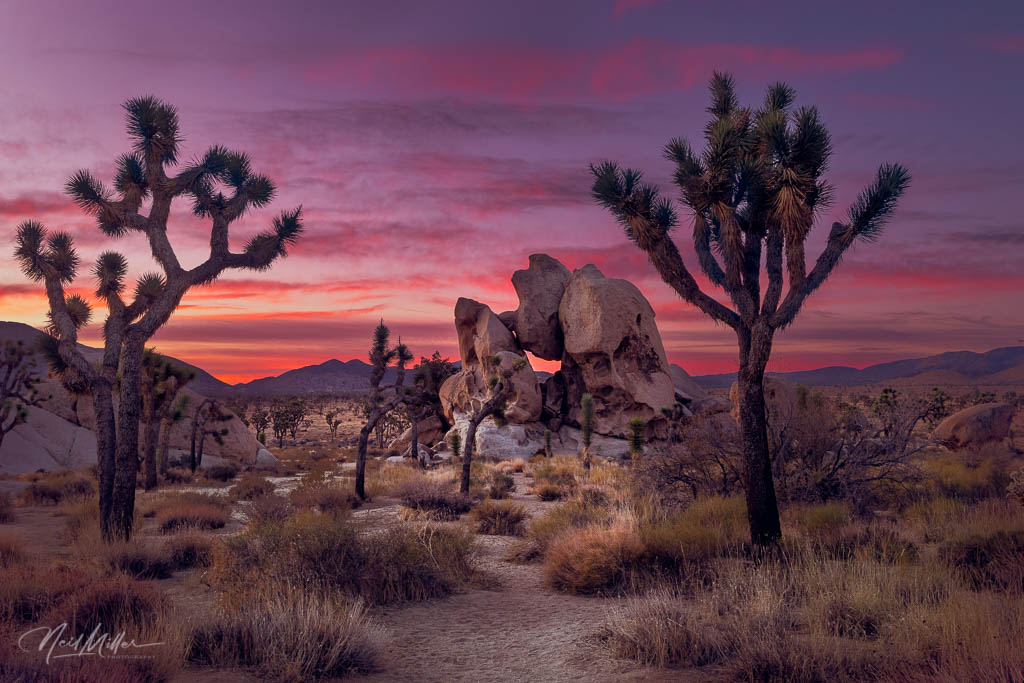 I soon found a composition I liked. A boulder formation had a bit of a window through which I could see a bit of sky. The boulders were nicely framed by two Joshua Trees. A path through low growth leads your eye to the rock formation. My hope was that if the sky caught a bit of color as the sun came up, that you would see a bit of it through the “window”. And, as you can see from the photo below, the sky did not disappoint.