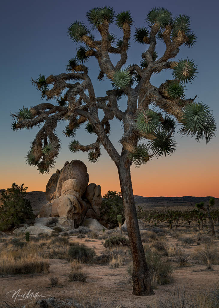 As the sun rose higher, it started to peek through gaps in the boulders, giving a warm glow to the Joshua Trees.
