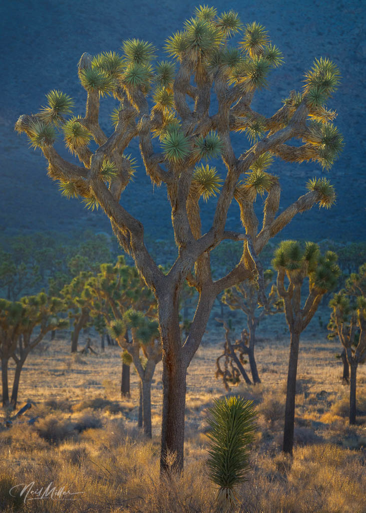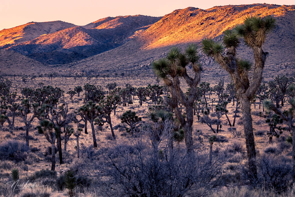 The shadowy distant hills provide a nice backdrop to the warm golden tones of the grass and the green leaves of the Joshua Trees in the image below.