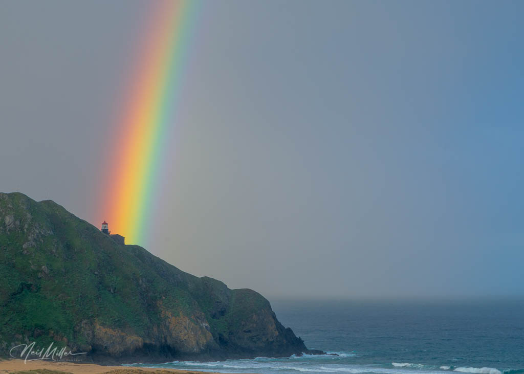 As I was packing up to leave, the mist turned to light rain. A few minutes later it stopped and a beautiful rainbow appeared. I had to scramble to get down the road a bit to capture this image. The rainbow was already starting to fade when I got to a spot where it lined up with the lighthouse.