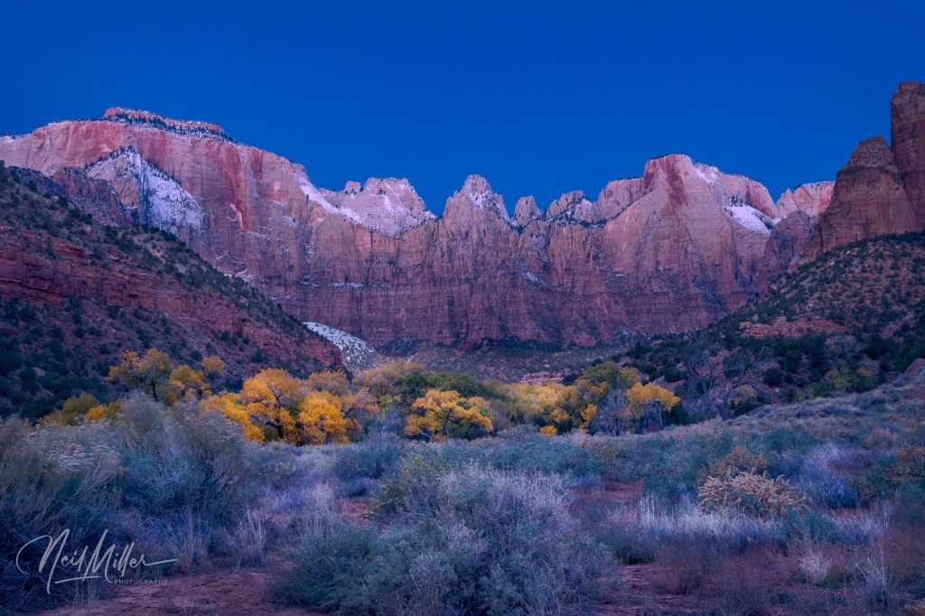 Our first morning in the park, we were up before sunrise to photograph the Towers of the Virgin. I captured the following image just at the tail end of Blue Hour, just as the sun was starting to lighten up the sky but before it came up over the peaks behind us.