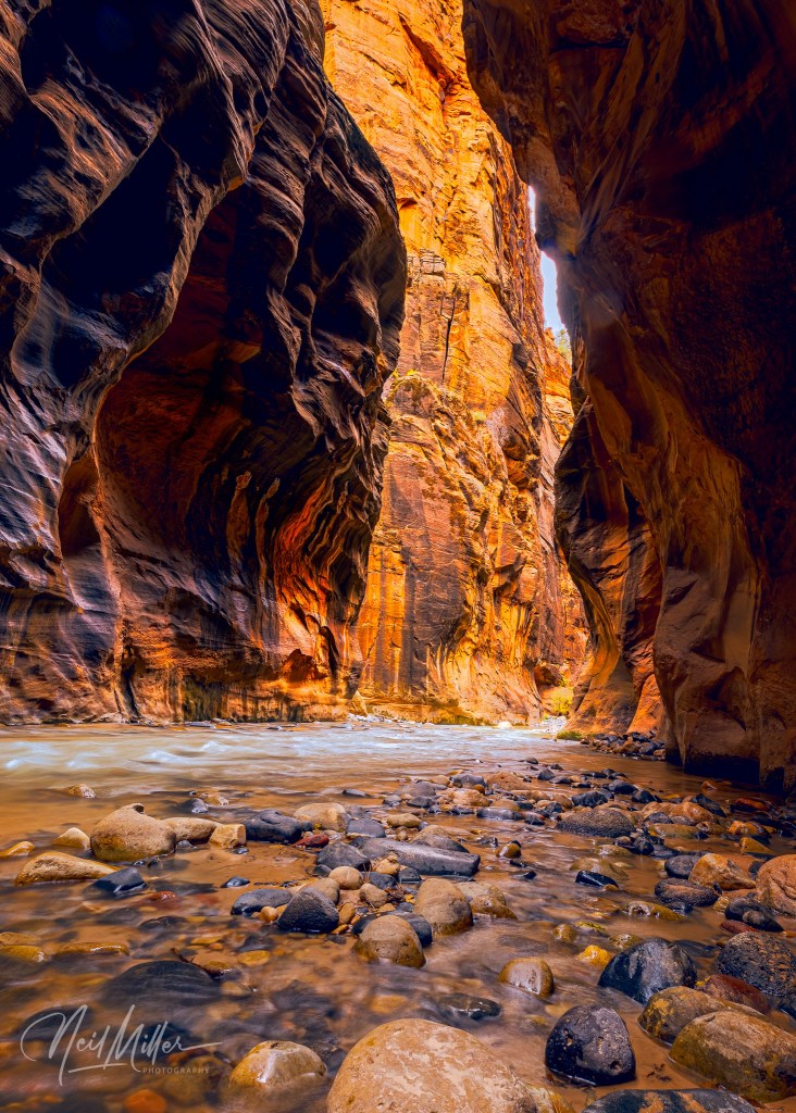 On our final day, three of us hiked The Narrows. This is a section of the Virgin River that flows through some narrow canyons. The hike involves wading through water that, at this time of year, ranged from ankle deep to mid-thigh. While we had waterproof pants and neoprene socks, the boots let water through. Needless to say, the water was very cold and my feet alternated between being comfortably warm and freezing cold. I believe we hiked about 1.5 miles upstream then returned. All-in-all it was an interesting experience, worth doing once anyway. Photographically, with overcast skies, the light was less than desirable. I did come away, though, with the following two images.