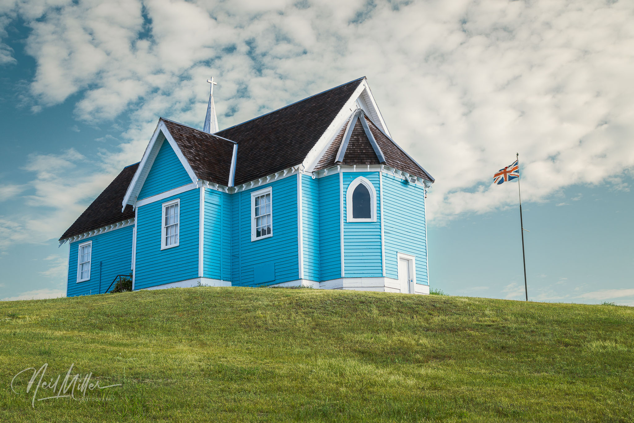 Well before arriving in the village, the prominent “church on the hill” came into view. The bright blue church, St. Edmund’s Anglican Church, was built in 1916. With a dwindling congregation, the last regular church service was held in the 1960’s. When a village homecoming was planned for 1974, it was decided that the conspicuous landmark needed a bit of TLC including a coat of paint. Unfortunately, no funds for paint were available however the local lumberyard donated a quantity of blue paint that it had been stuck with. The formerly cream-colored church became bright blue.